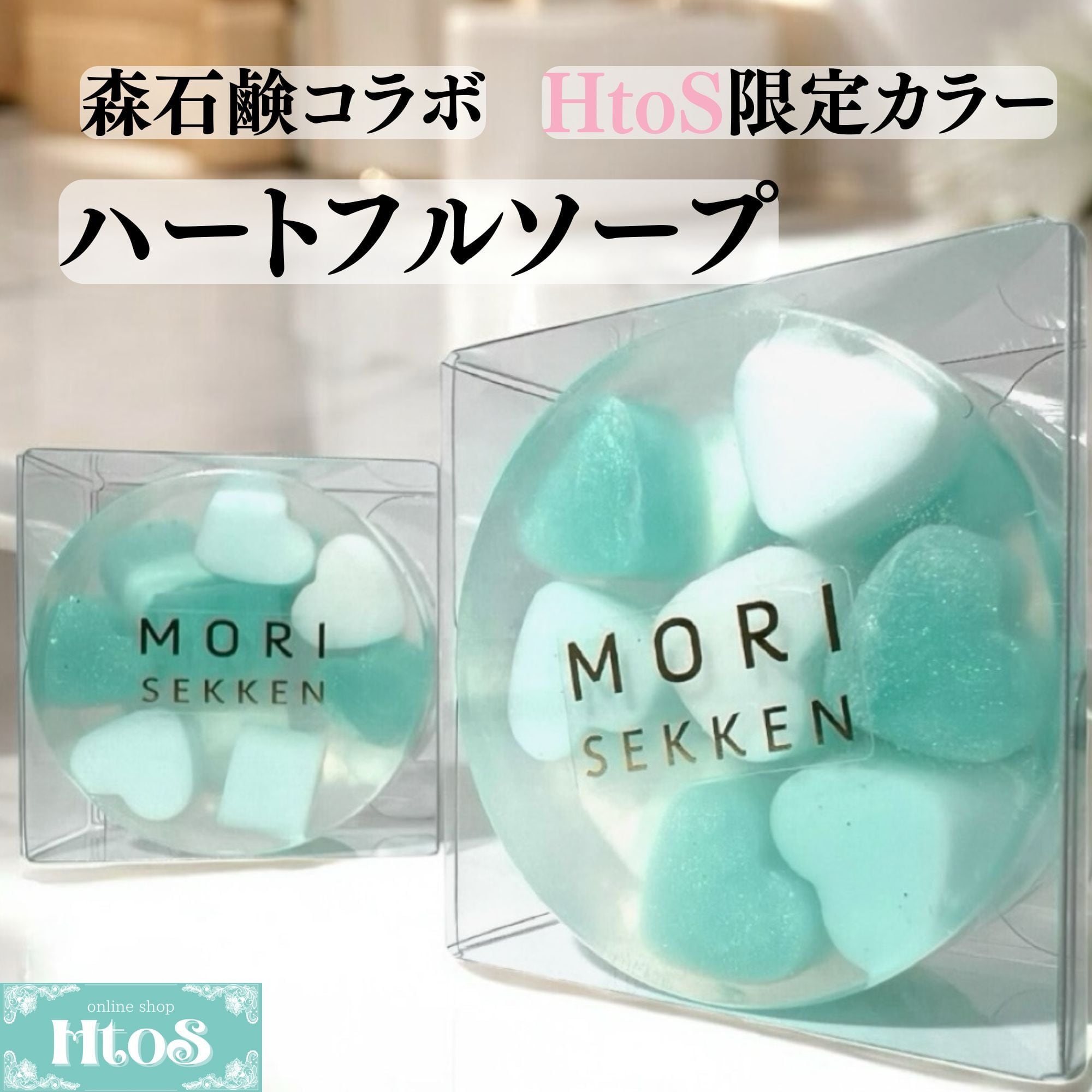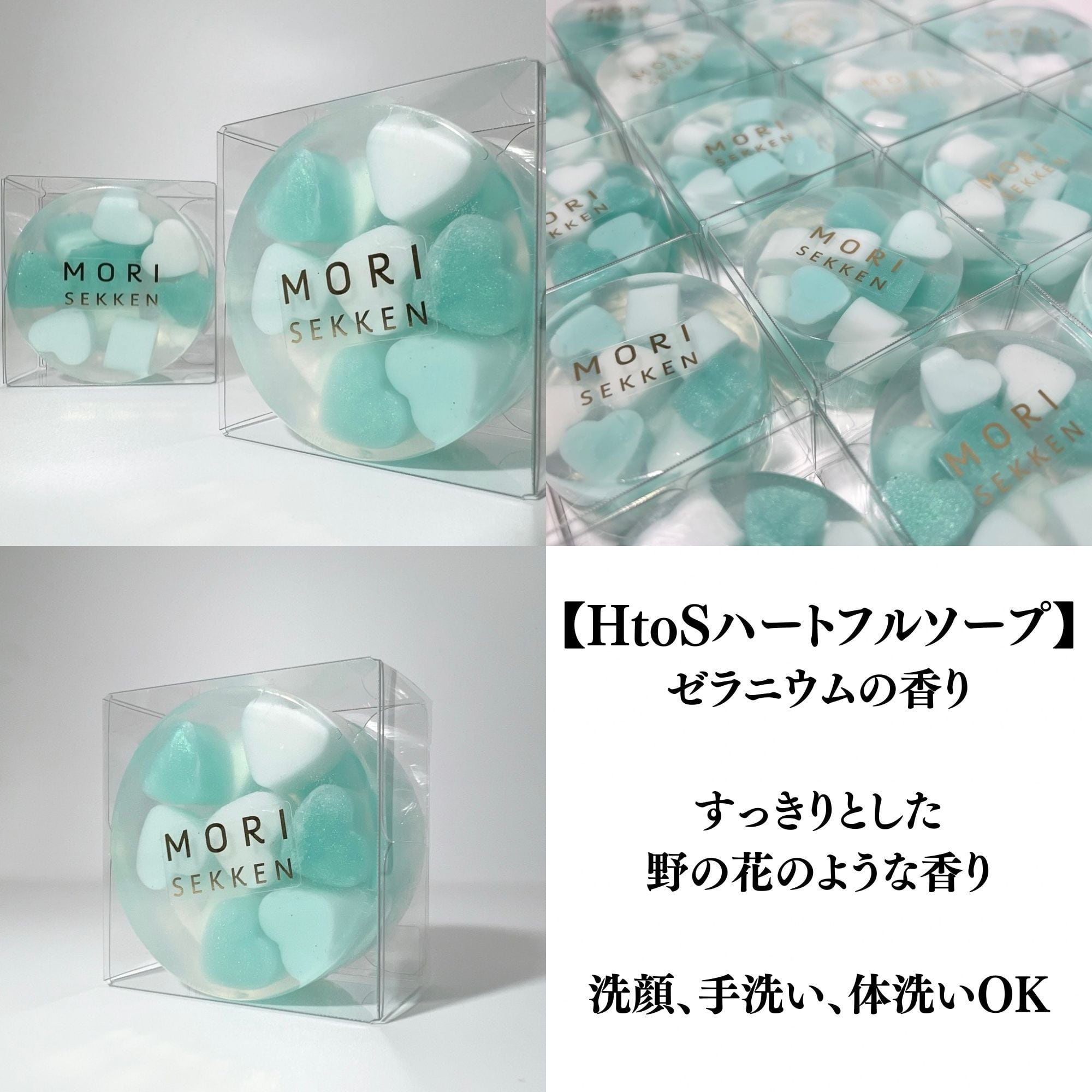 森石鹸のハートフルソープ。HtoS限定カラーで仕上げた、かわいいハートがたくさん詰まった固形石鹸です。ゼラニウムの香りがやさしく広がる、石鹸ギフトやプレゼントにも人気のハンドメイド石けんです。