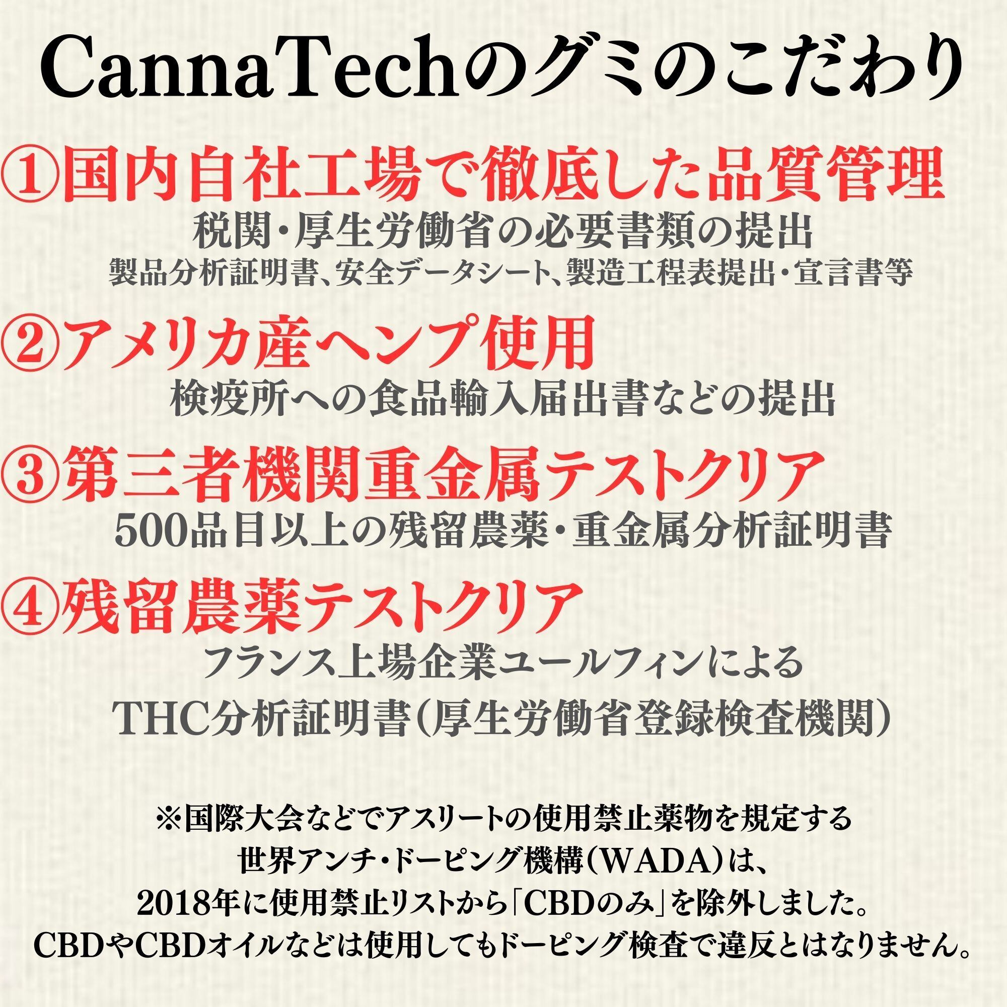 CannaTechは、世界に誇れるJapan QualityのCBDをモットーに、原料の輸入から製造販売までを一貫した品質管理、最も厳格な食品安全の国際規格のひとつである「FSSC22000」認証取得を経て、200を超える要求事項クリアし、厳重な管理体制のもと、国内自社CBD工場にて商品を製造。原料輸入時、製品化後に第三者機関においてカンナビノイド成分分析を行い、THCゼロを確認して、安定した品質を担保。革新と誠実さをもって、健康とウェルネスを次のステージへと導く国産のCBDブランドです。
