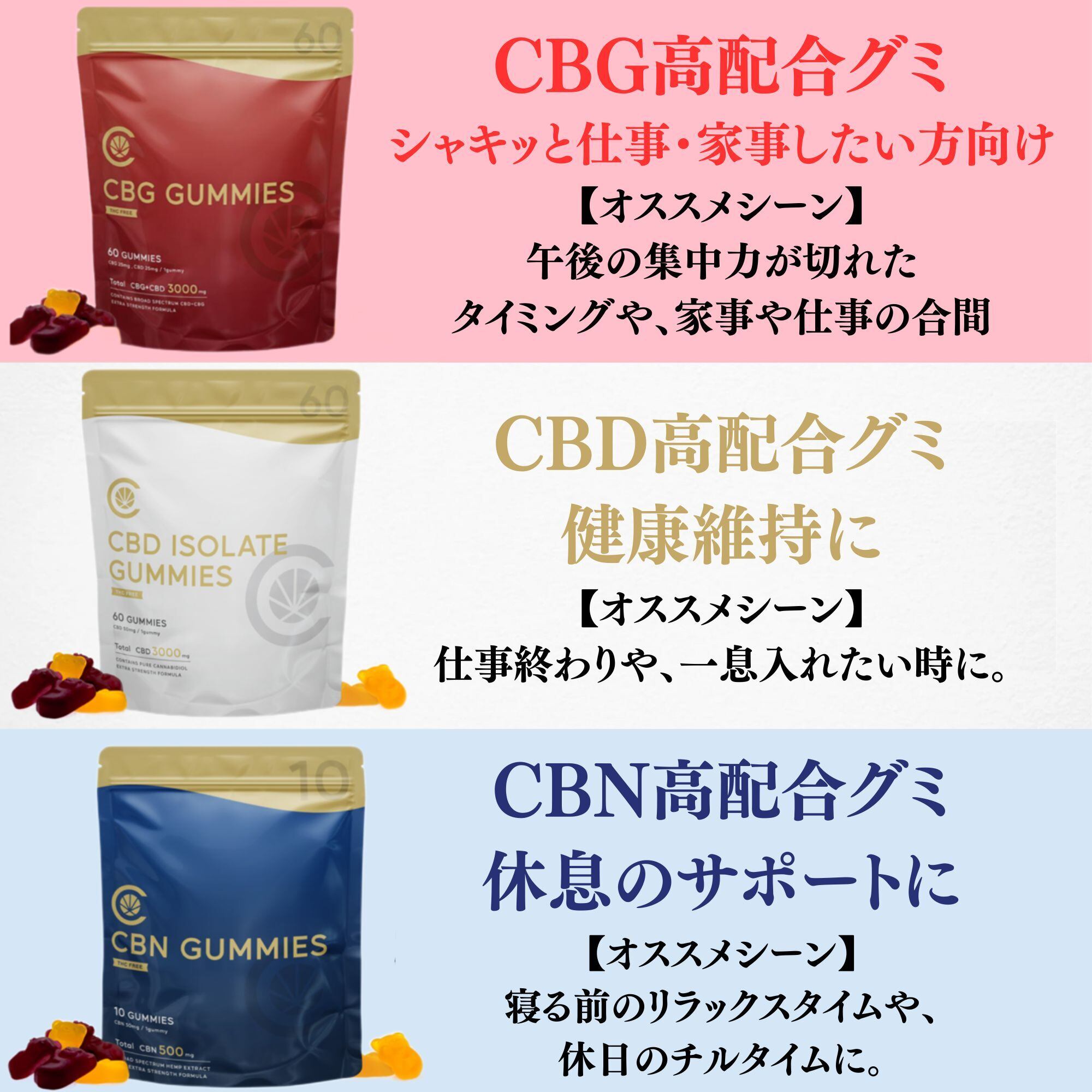 老若男女問わず、たくさんの方にご利用いただいております。特に30~50代の方には多くの支持を頂いており、摂取量がコントロールしやすく、場所を選ばないグミが人気です。睡眠のお悩みや日々のストレスケアなどにご利用いただいており、悩みに応じてCBNやCBGを使い分けている方もいらっしゃいます。