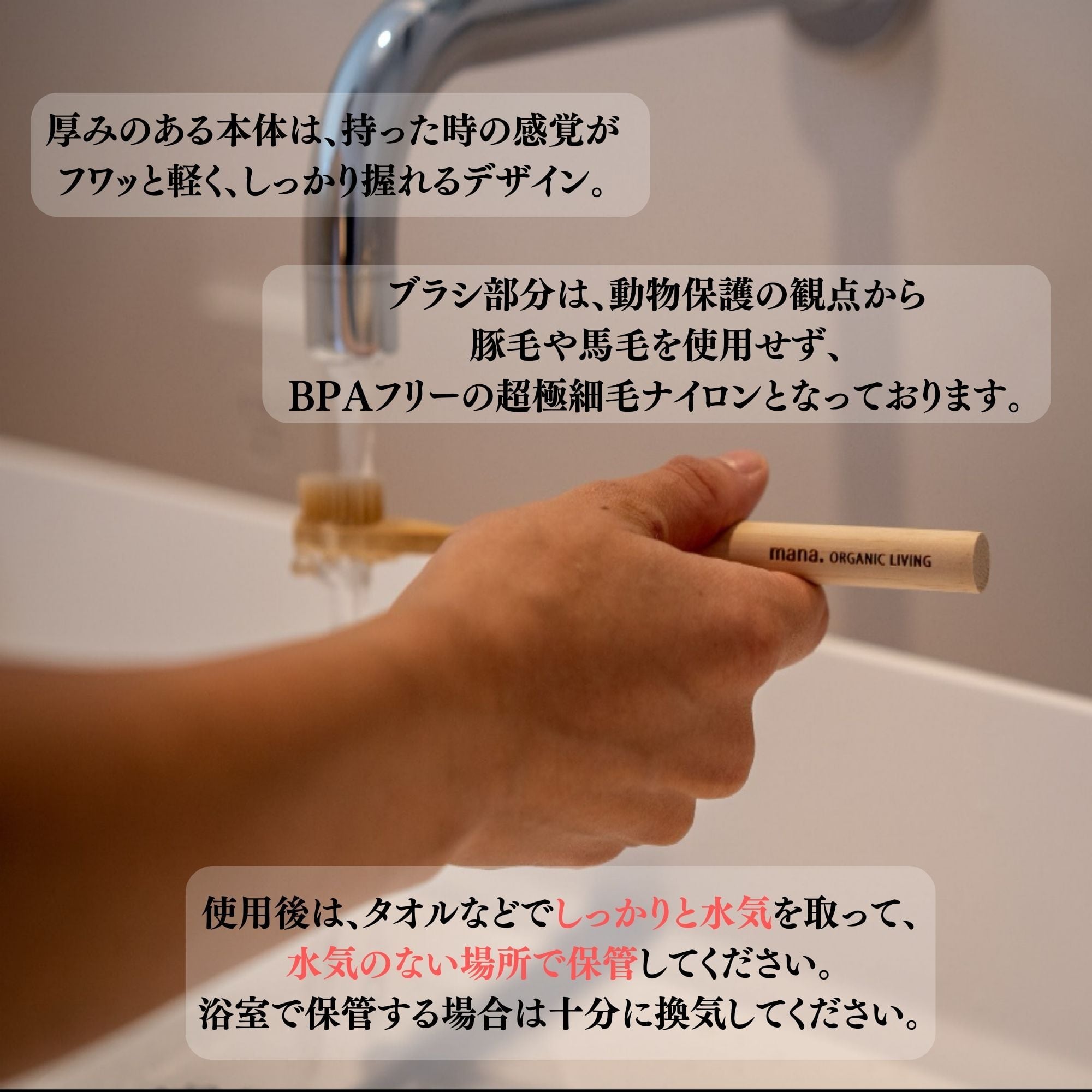 別ページで販売している、速乾性のある歯ブラシスタンド珪藻土と一緒に使用していただくのをオススメします。