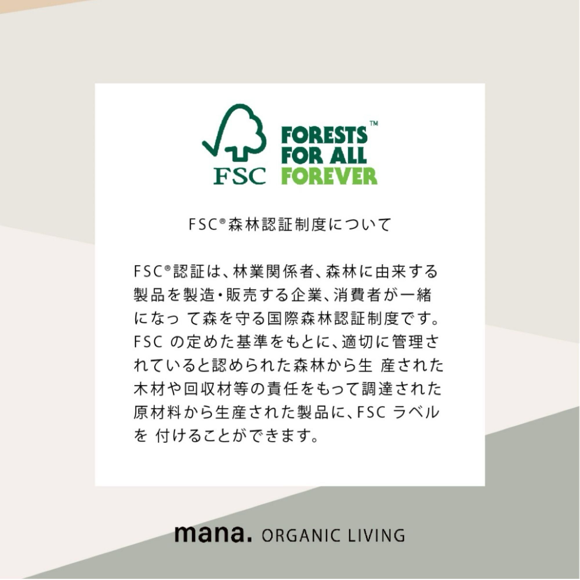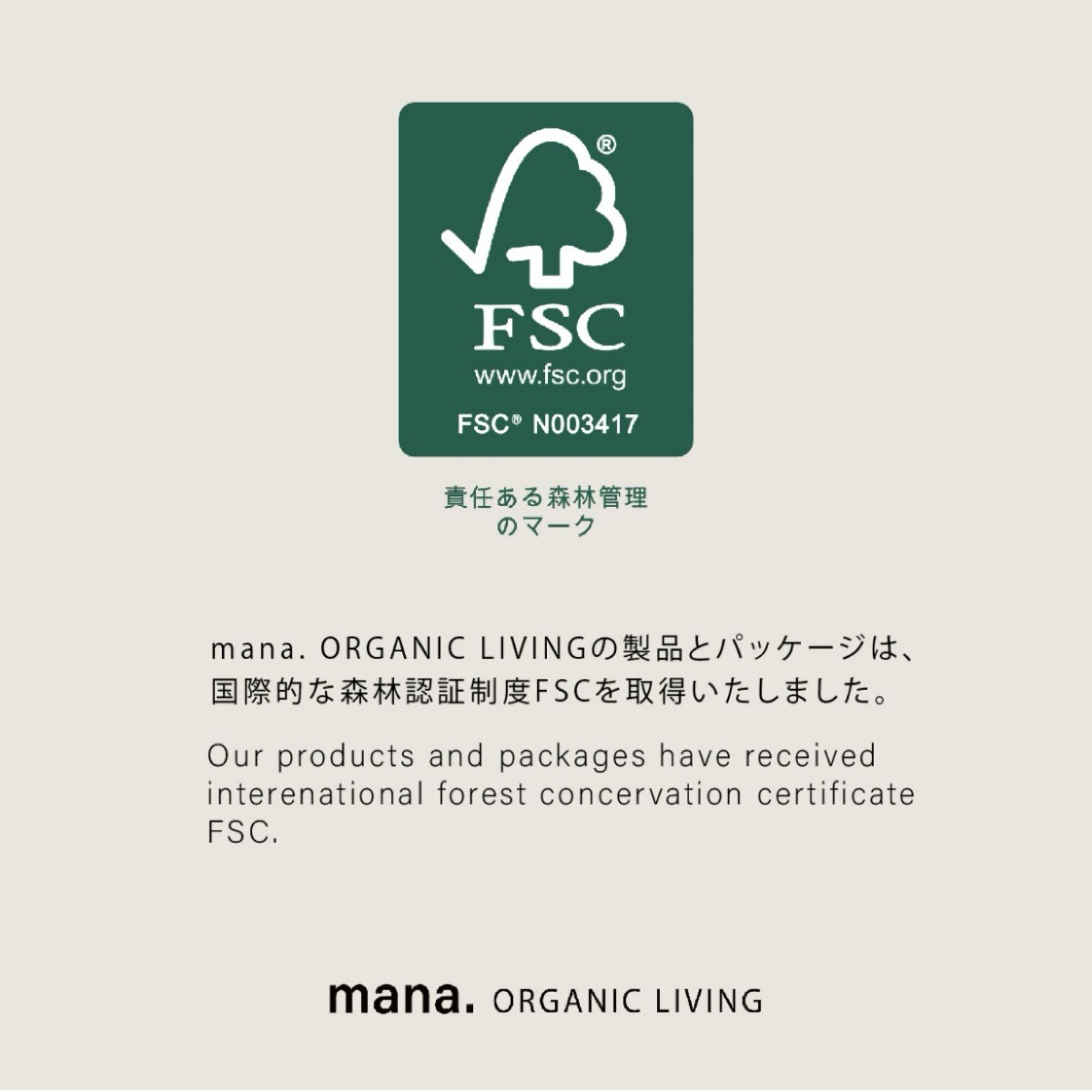 mana.では、素材や生産過程の背景にもこだわり、環境、社会、経済分野の利害関係者の合意によって支持された、責任ある森林管理の原則と基準に基づく国際森林認証制度FSCを取得したオーガニック竹を使用しています。