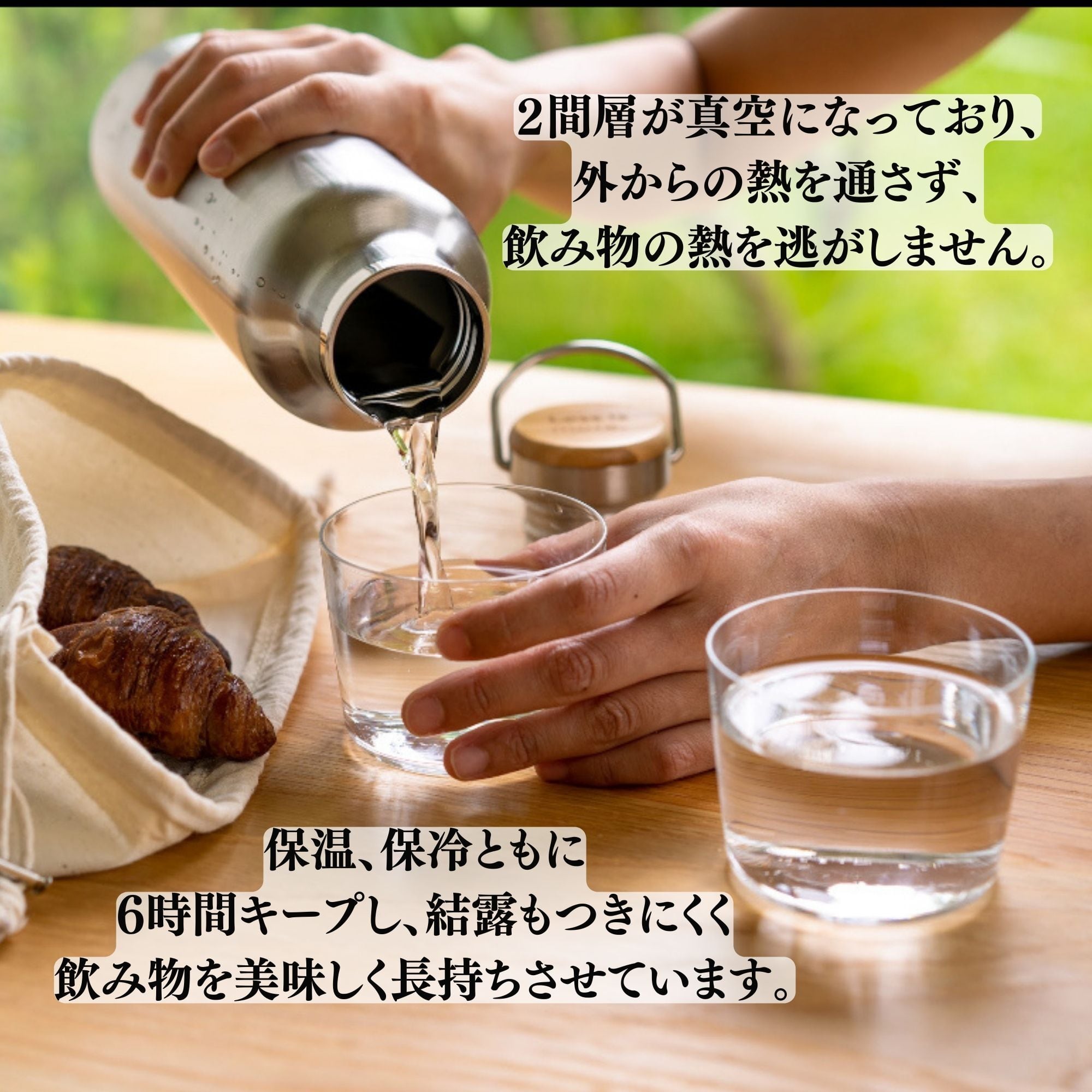 竹の温かみとステンレスのクールな手触りが特徴のエコボトルです。錆びない上質な素材18/8(304)ステンレスを使用し、真空二重構造で高い保温・保冷性能を持っています。便利な持ち手付きで、シンプルかつコンパクトなデザインで軽さを実現いたしました。2間層が真空になっており、外からの熱を通さず、飲み物の熱を逃がしません。保温、保冷ともに6時間キープし、結露もつきにくく飲み物を美味しく長持ちさせてます。フタを外してすぐ飲める直飲みタイプで、飲み口は優しい口触りです。ボトルのキャップと本体の間にシリコンリングがあり、飲み物をしっかり密封し漏れを防ぎます。シンプルな構造でシリコンリングも簡単に取り外していただけるので洗うのも楽チンです。