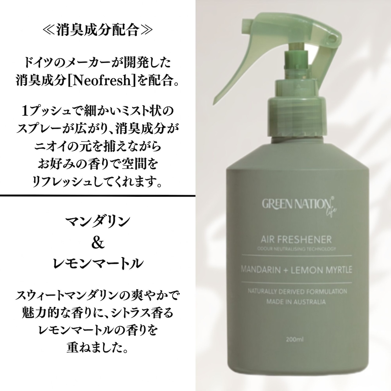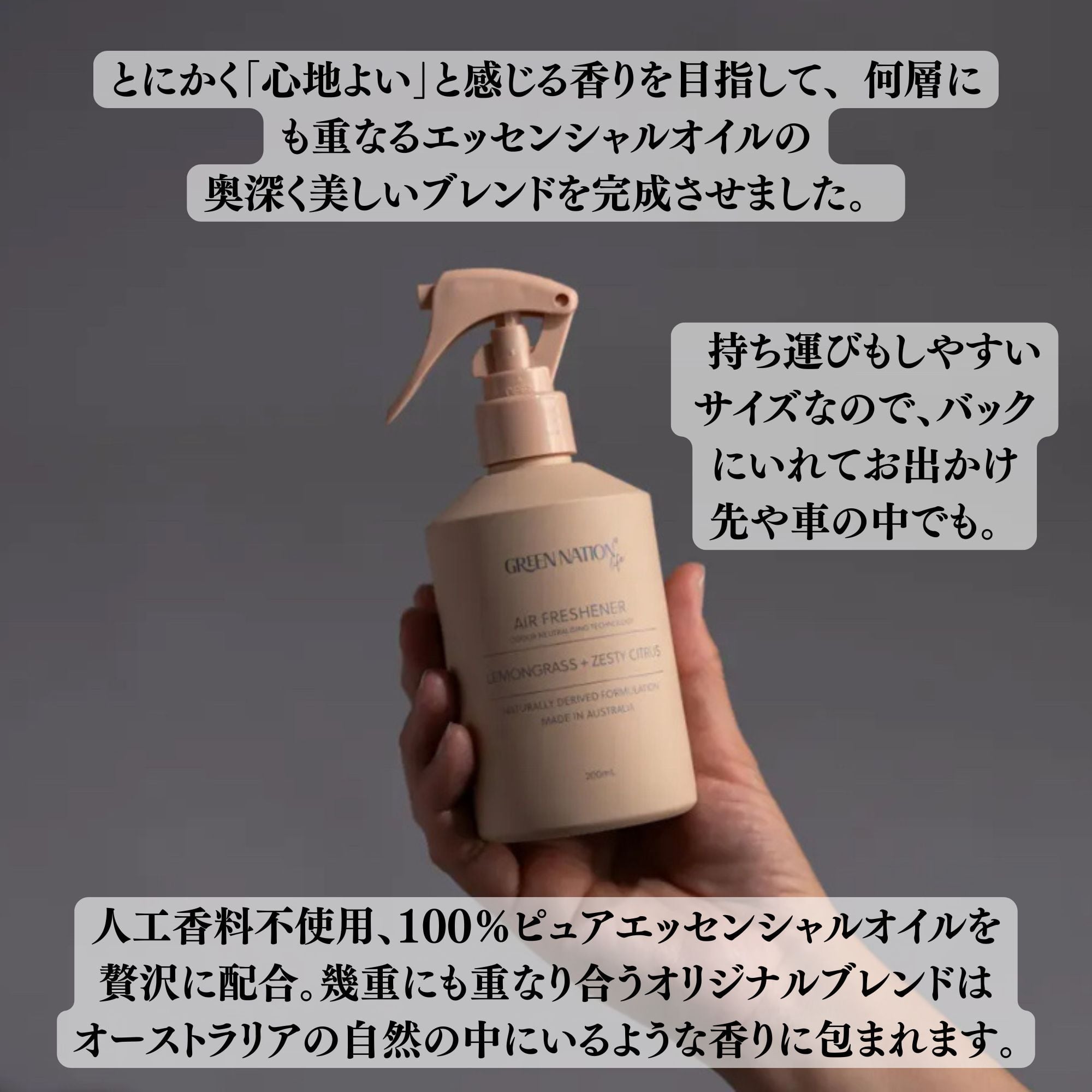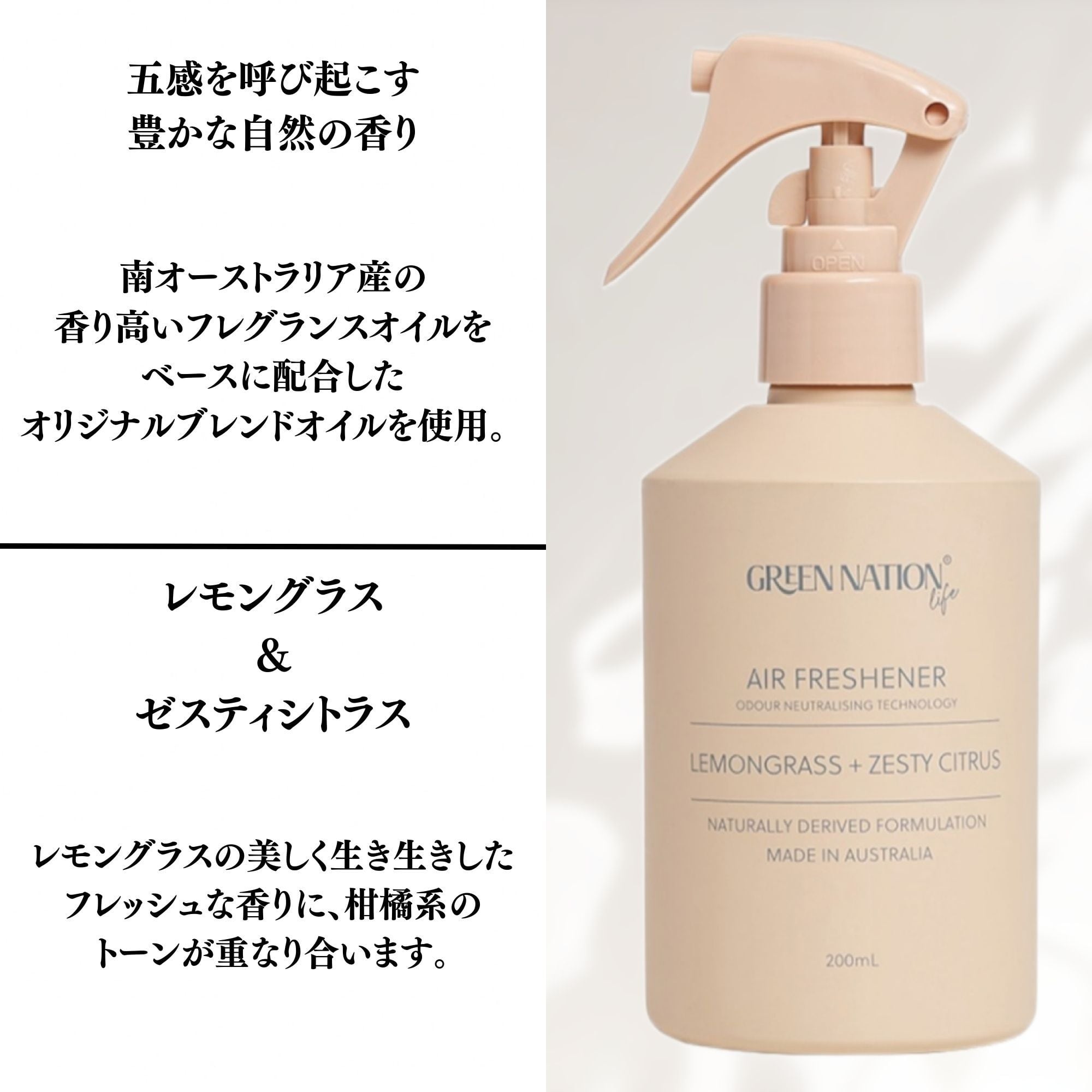 厳選した天然由来成分にこだわり、人に環境に優しいホームケア&エアケアブランド、グリーンネイションライフ。 「自分たちが本当に使いたいもの」をエコ大国オーストラリアのメルボルンからお届け。 「使った時に気分が上がること!」を大切にしたアイテムは、最高品質の原料を厳選し使用した商品をオーストラリアで製造され、パッケージは全てリサイクル素材を使用し全製品がヴィーガンフレンドリー。人工香料不使用、100%ピュアエッセンシャルオイルを贅沢に配合。 幾重にも重なり合うオリジナルブレンドは、オーストラリアの自然の中にいるような香りに包まれます。