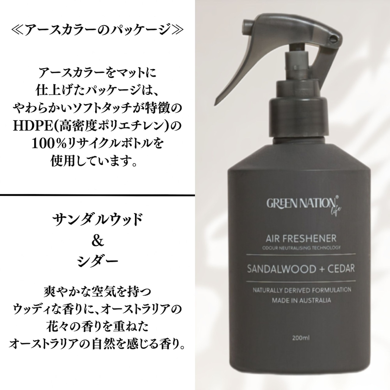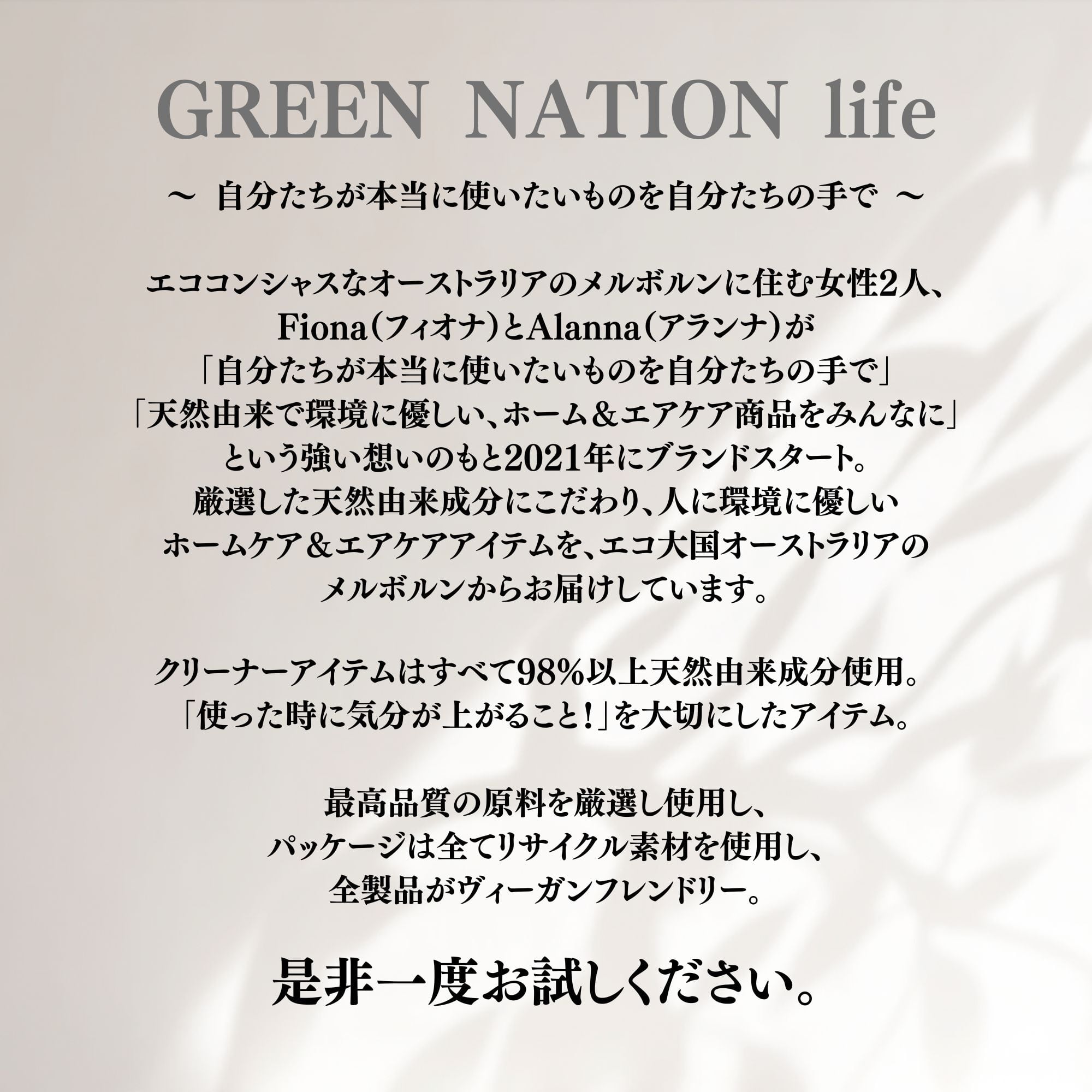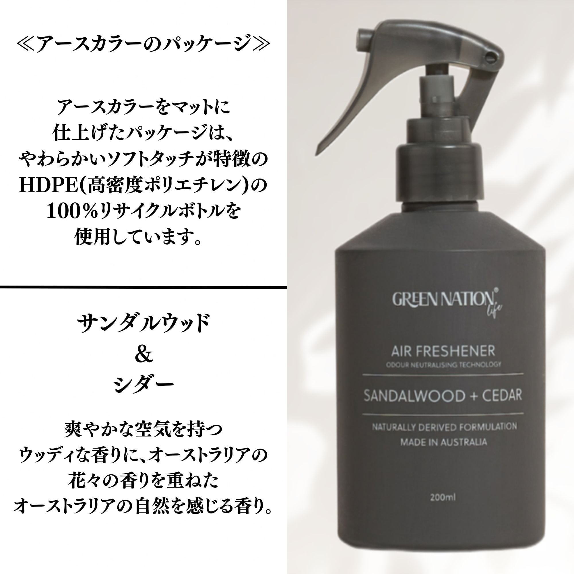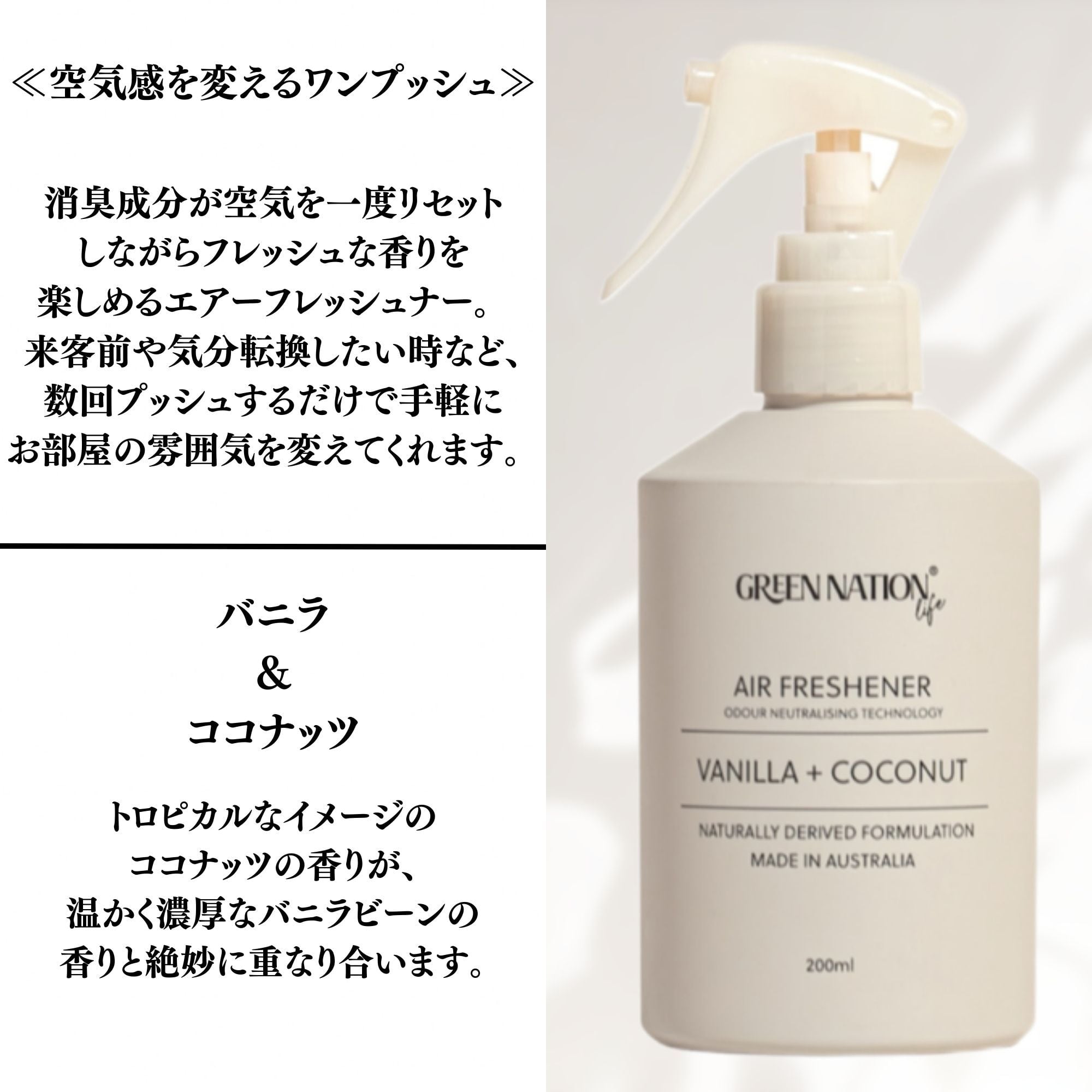 厳選した天然由来成分にこだわり、人に環境に優しいホームケア&エアケアブランド、グリーンネイションライフ。 「自分たちが本当に使いたいもの」をエコ大国オーストラリアのメルボルンからお届け。 「使った時に気分が上がること!」を大切にしたアイテムは、最高品質の原料を厳選し使用した商品をオーストラリアで製造され、パッケージは全てリサイクル素材を使用し全製品がヴィーガンフレンドリー。人工香料不使用、100%ピュアエッセンシャルオイルを贅沢に配合。 幾重にも重なり合うオリジナルブレンドは、オーストラリアの自然の中にいるような香りに包まれます。