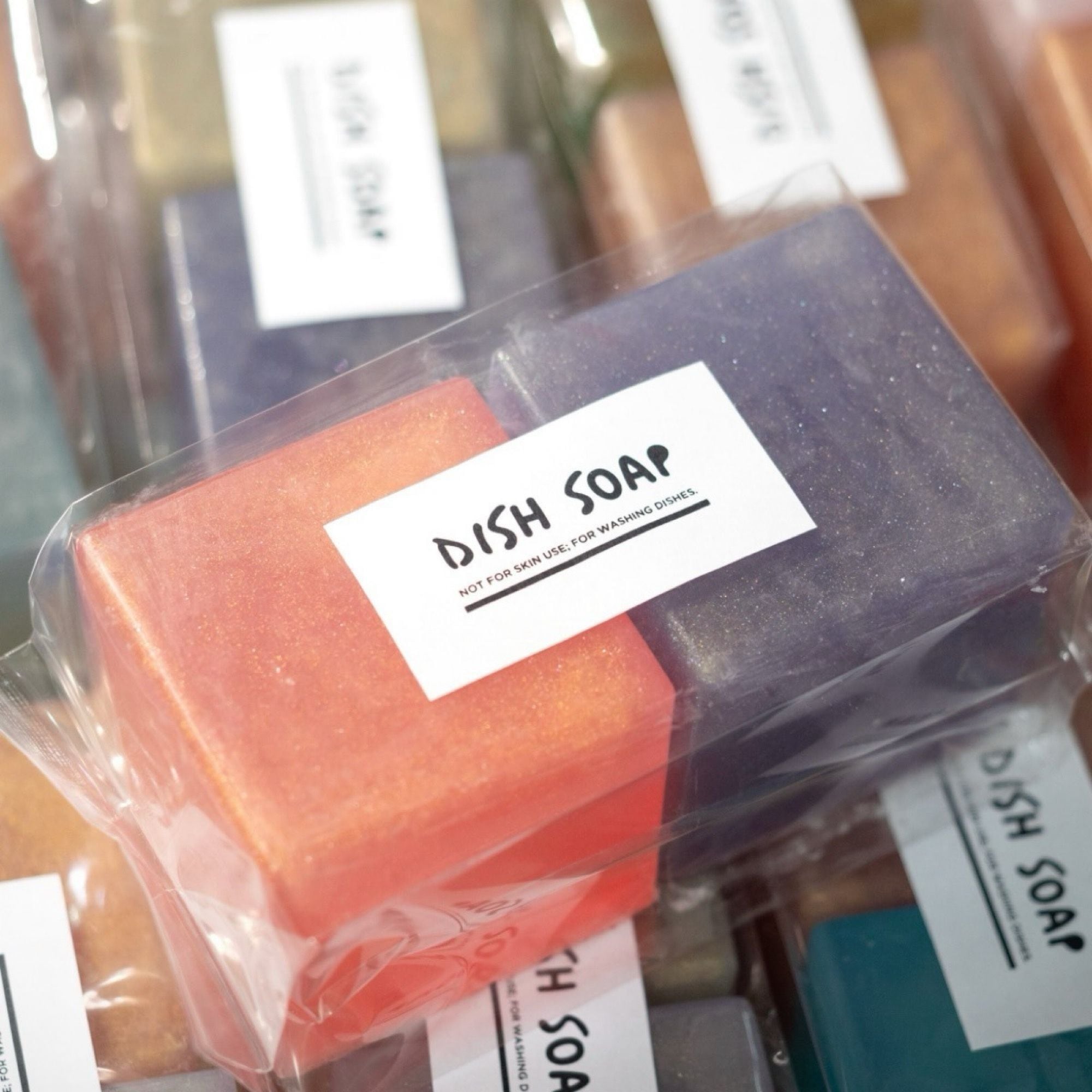 森石鹸の工場で出た石鹸の切れ端を、台所用石鹸専用の設備でリサイクルして作られた「お皿洗い用石鹸 ぺったんこサイズ」です。環境にもやさしい、台所用の固形石けんです。