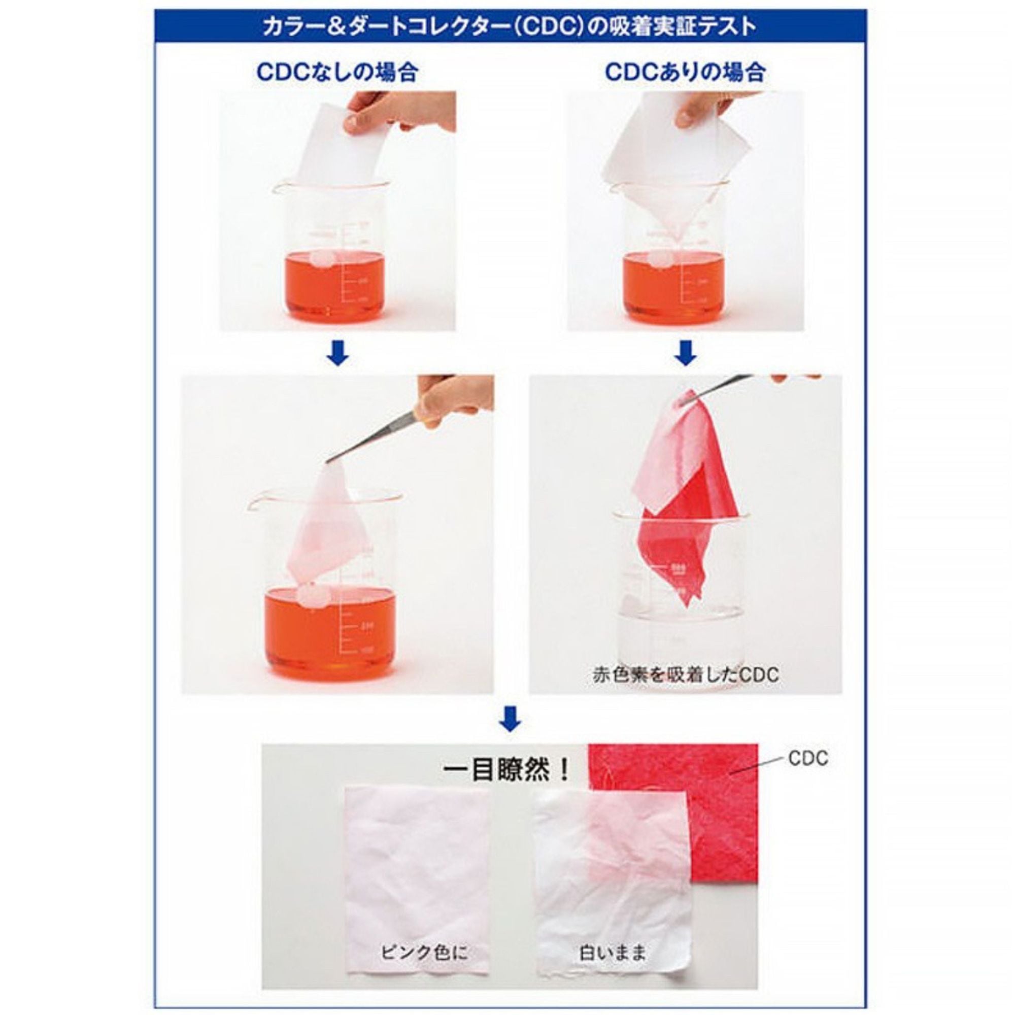 洗濯が終わったら白シャツがピンク色に…こんな経験ありますよね?色移りやくすみは、衣類から出る色素や洗濯水の汚れが原因。カラー&ダートコレクター(CDC)の特殊シートが色素や汚れを吸着し色移りを防ぎます。使い方は簡単。洗濯物と一緒にシートを1枚入れるだけ。白物も色・柄物も一度に洗ってください。衣類はきれいに、おまけに洗濯1回分の節水・節電・時短までできます。