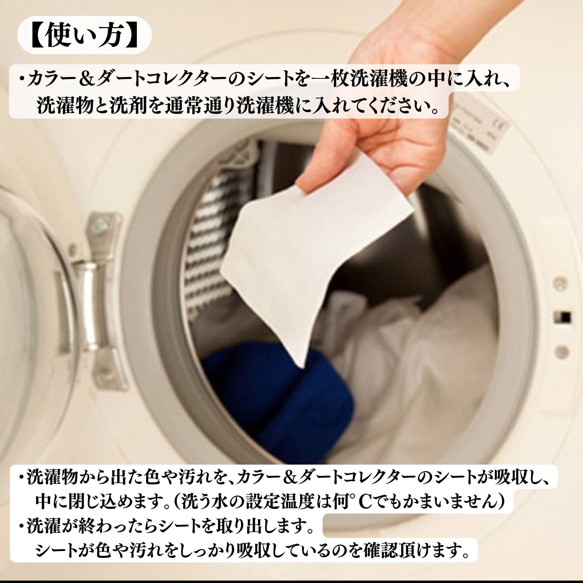 1)カラー&ダートコレクターのシートを一枚洗濯機の中に入れ、洗濯物と洗剤を通常通りに洗濯機に入れて下さい。