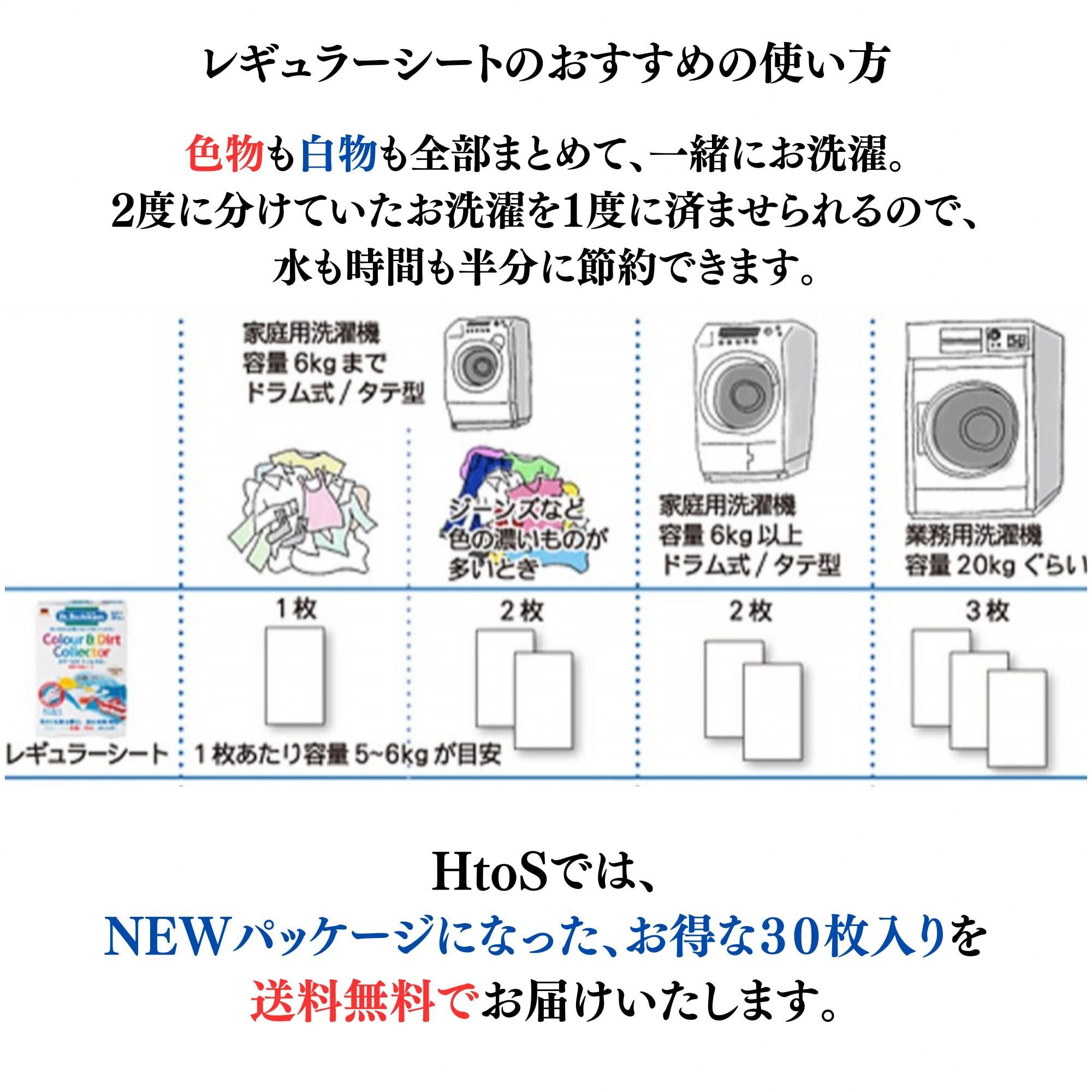 色移り防止シート30枚入り・・・レギュラーシート。1枚あたりの洗濯容量は5,6kg程度です。お得な30枚入りセットです。