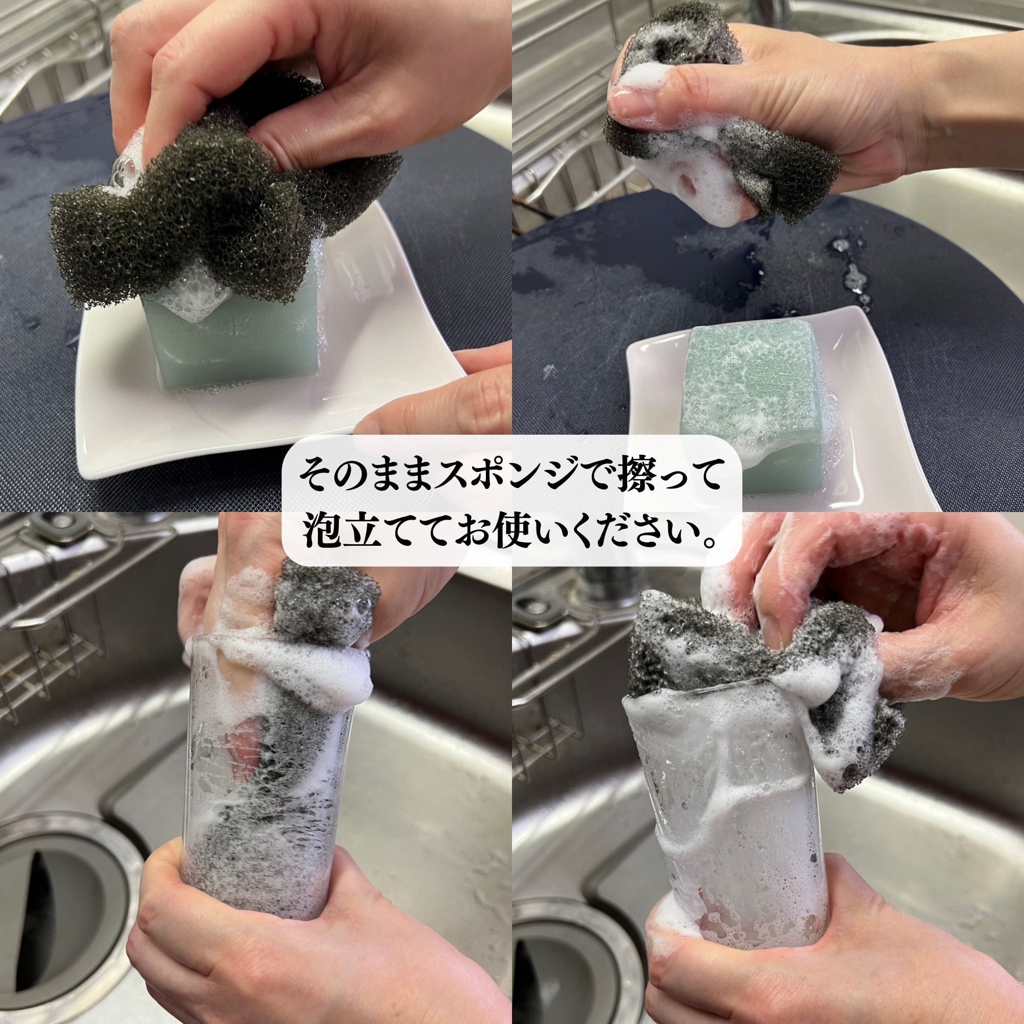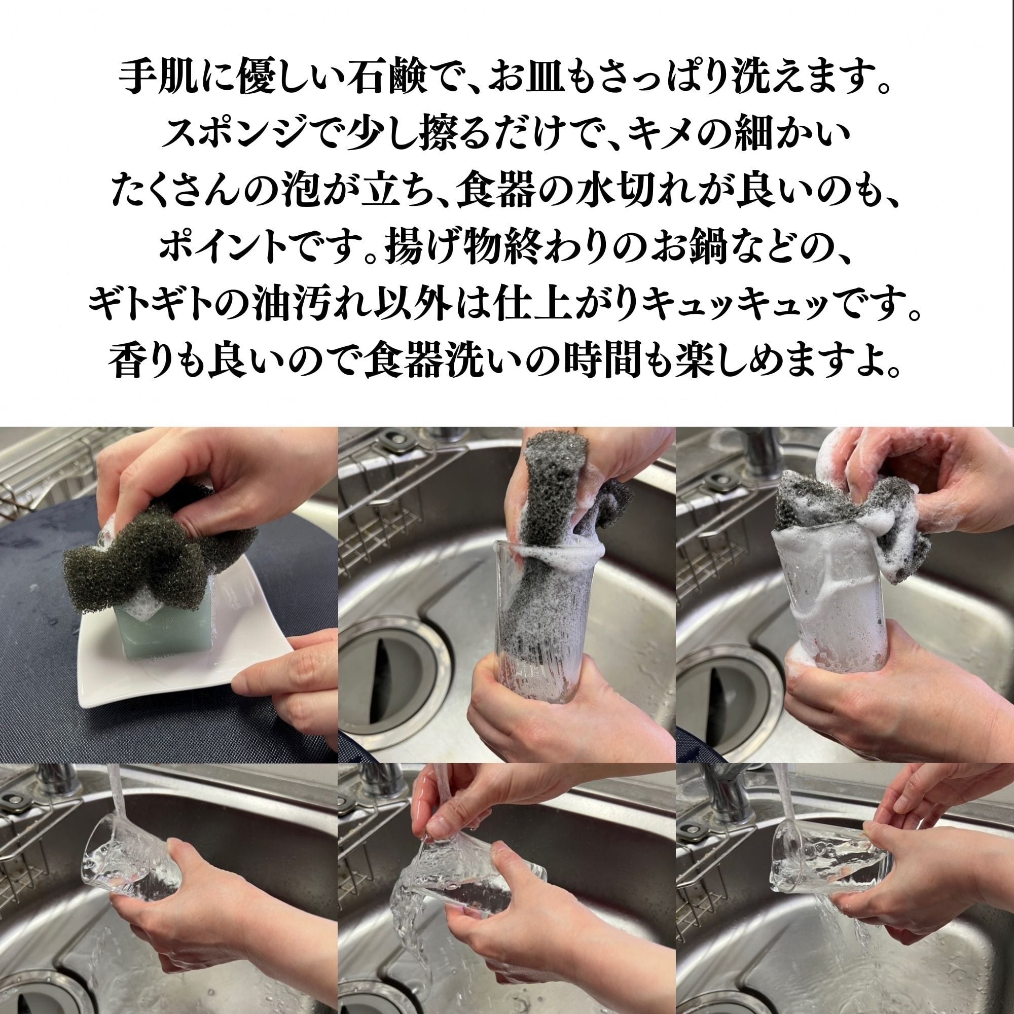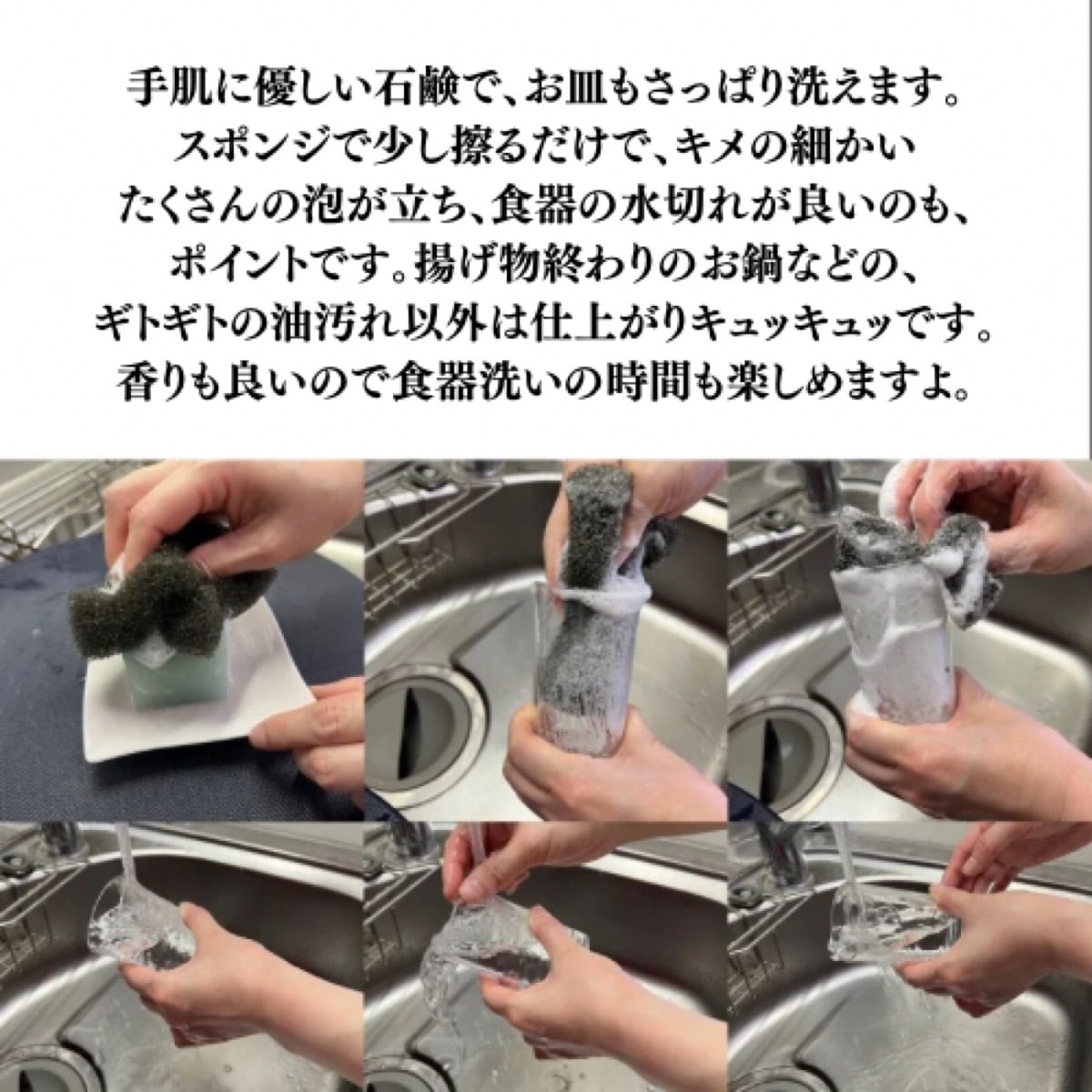 スポンジで直接こすって泡立てるだけで、食器の汚れをすっきり洗い上げます。泡立ちが良く、水切れもスムーズ。手肌にやさしい洗い心地が特長です。