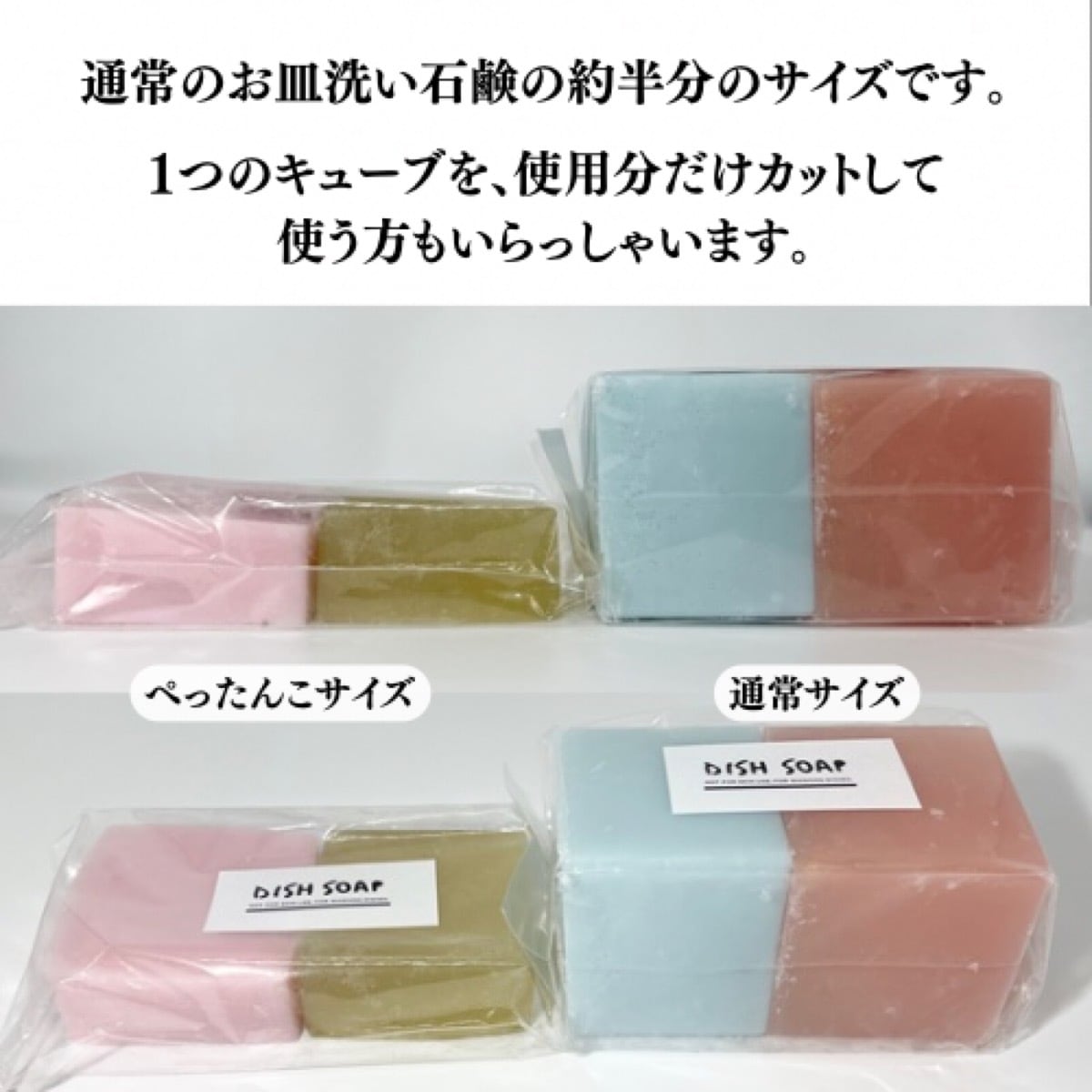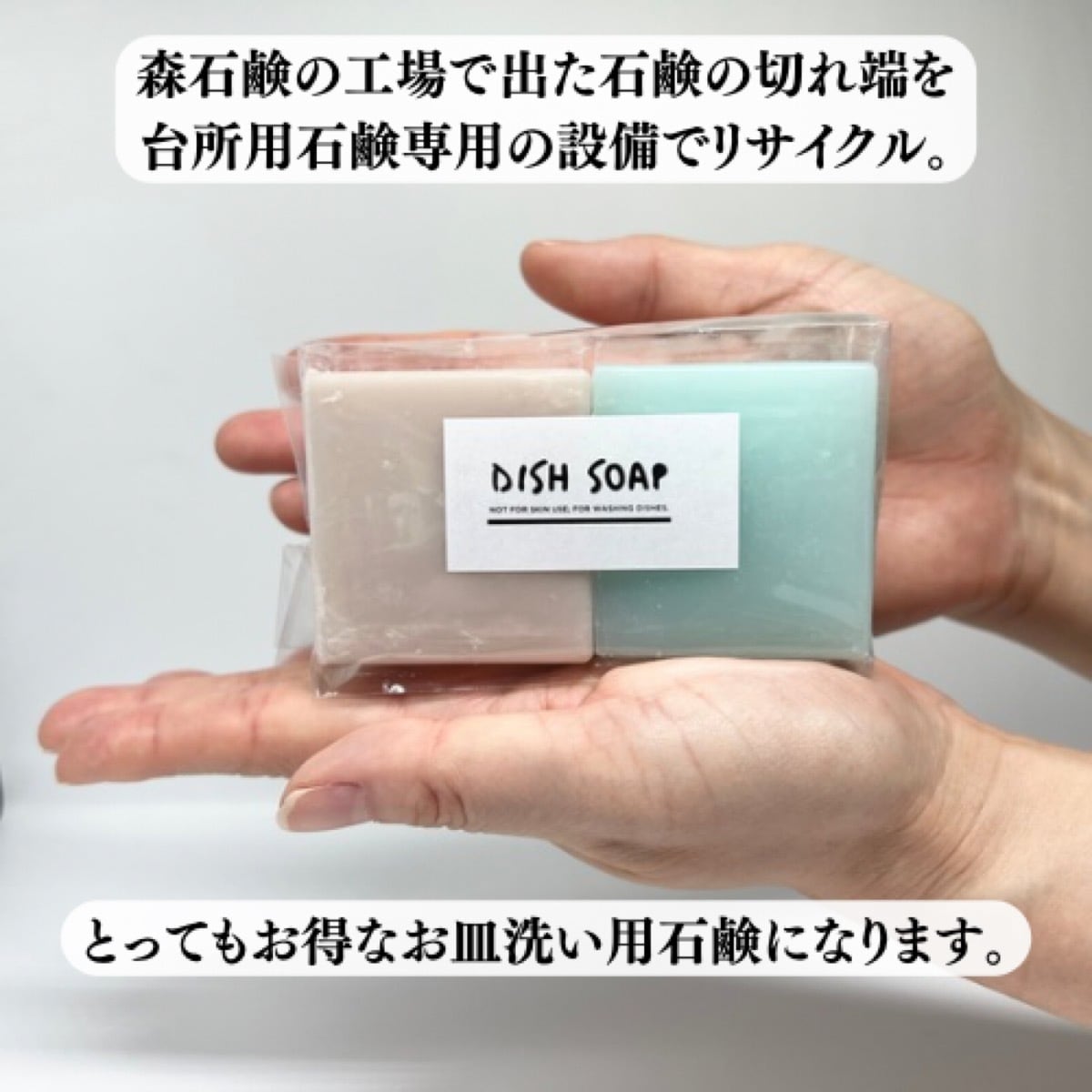 森石鹸の工場で出た石鹸の切れ端を、台所用石鹸専用の設備でリサイクルして作られた「お皿洗い用石鹸 ぺったんこサイズ」です。環境にもやさしい、台所用の固形石けんです。