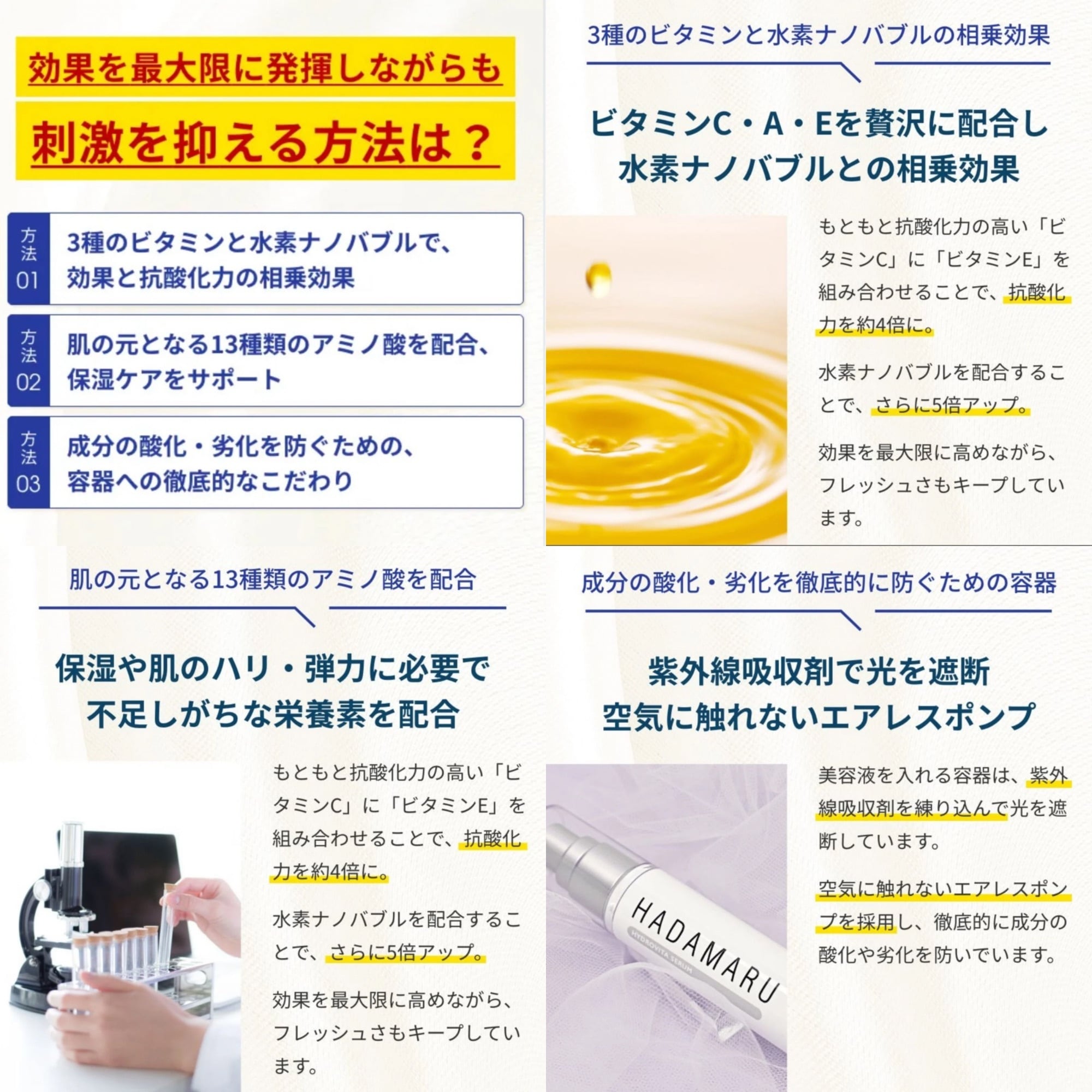 水素ナノバブルで届ける3種のビタミン(ビタミンC × レチノール × ビタミンE)配合。