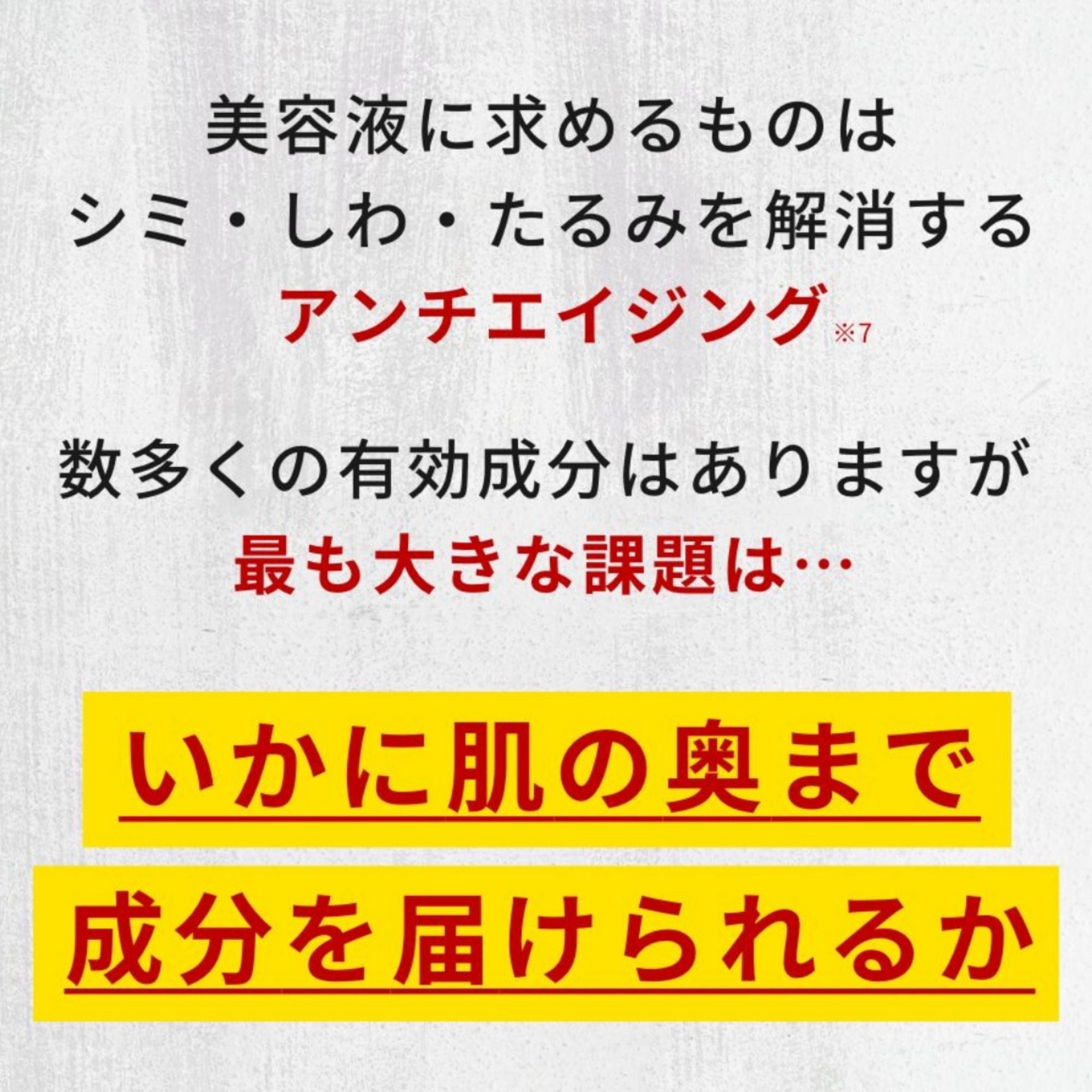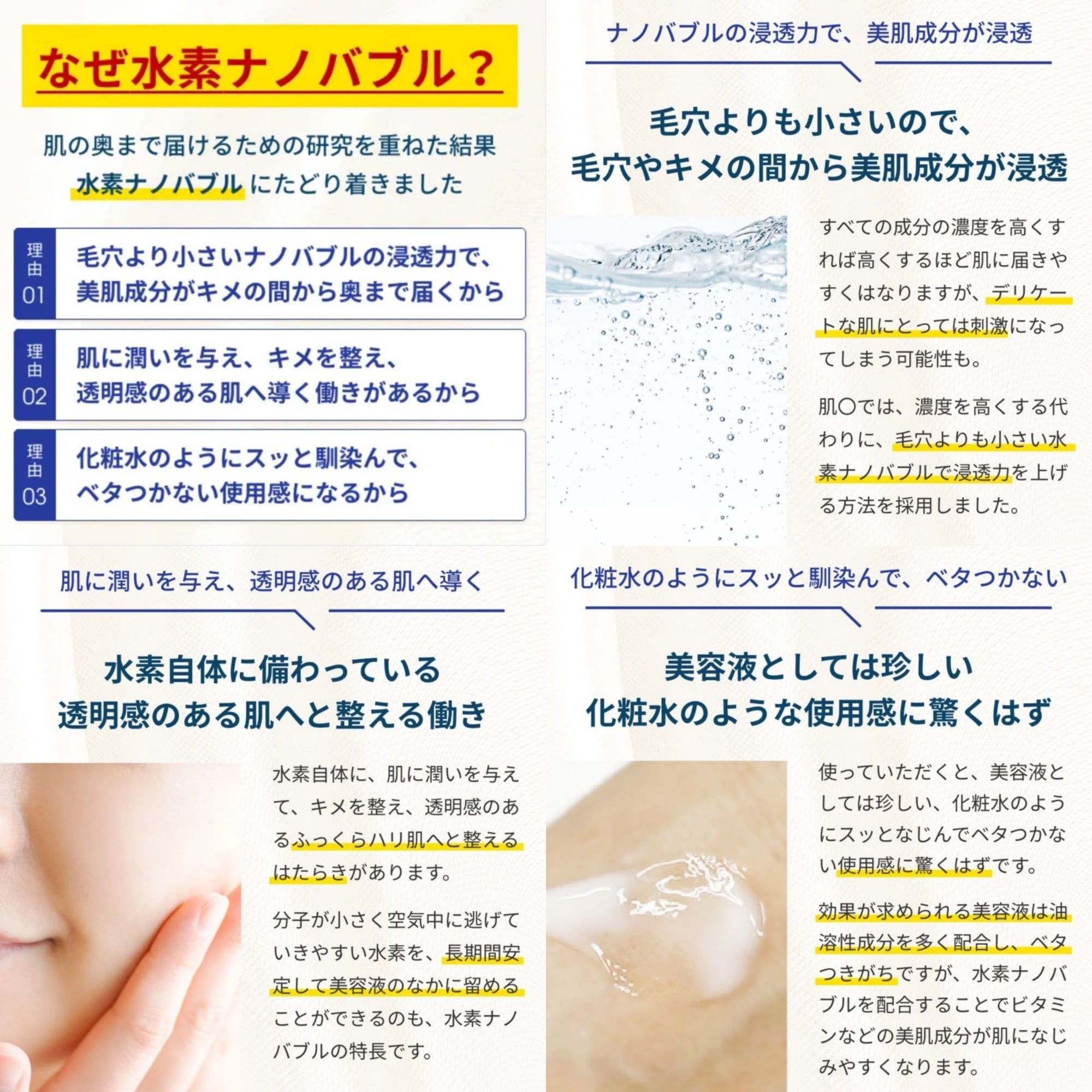 使ってみていただくと、美容液としては珍しい、化粧水のようにスッとなじんでベタつかない使用感に驚くはずです。その秘密は、ナノレベルの「水素バブル」。効果が求められる美容液は油溶性成分を多く配合するため、ベタつきがちですが、「水素ナノバブル」を配合することでビタミンなどの美肌成分が肌になじみやすくなるのです。