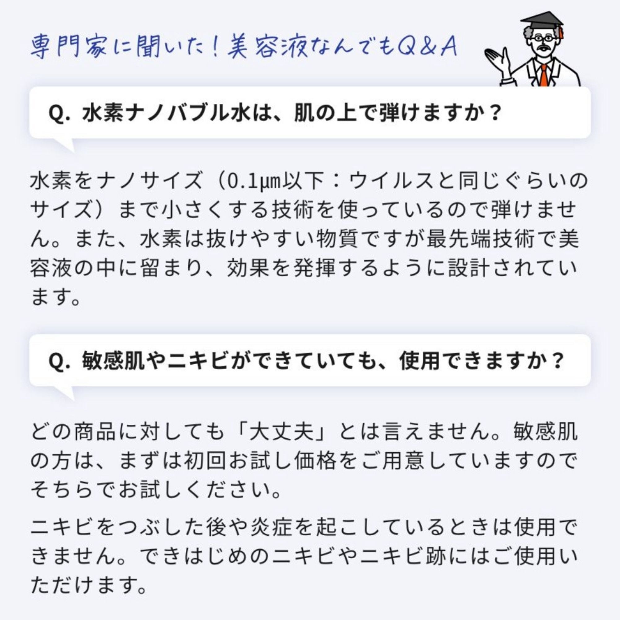 一番大きなこだわりは、美容成分を肌に届けるための方法です。すべての成分の濃度を高くすれば高くするほど肌に届きやすくはなりますが、デリケートな肌にとって刺激になってしまう可能性も。だから肌〇では、濃度を高くする代わりに「水素ナノバブル」で浸透力(※1)を上げる方法を採用しました。