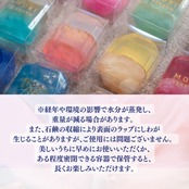 宝石石鹸は、すべて手作業で丁寧に作られているため、模様や色合いには一点一点個性がございます。見本写真は平均的なものを掲載しておりますが、実物とは異なる場合がございますことをご了承くださいませ。お届けしました石鹸が写真と色が違うや、写真と模様の出方が違うなどでお問い合わせ頂きましても、返金や返品、商品の交換には当店ではお応え出来かねます。ハンドメイド作品による個性とご理解くださいませ。