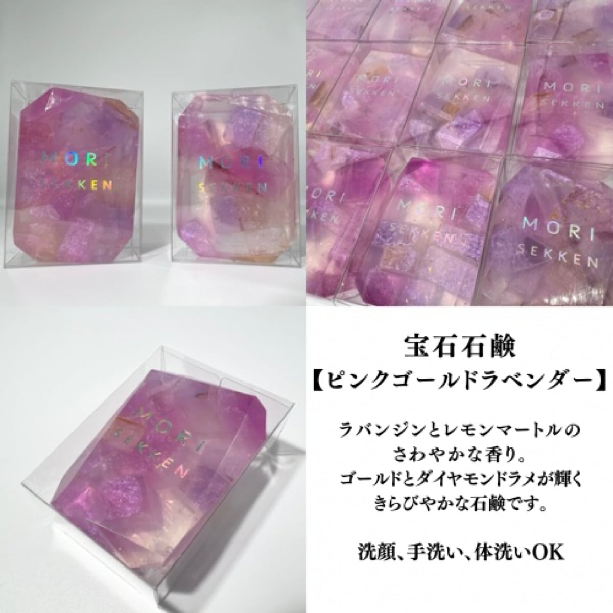 森石鹸の宝石石鹸 ピンクゴールドラベンダー。ゴールドとダイヤモンドラメが輝く華やかなデザインと、ラバンジンとレモンマートルの爽やかな香りが魅力の固形石鹸です。上品な石鹸ギフトにも選ばれています。