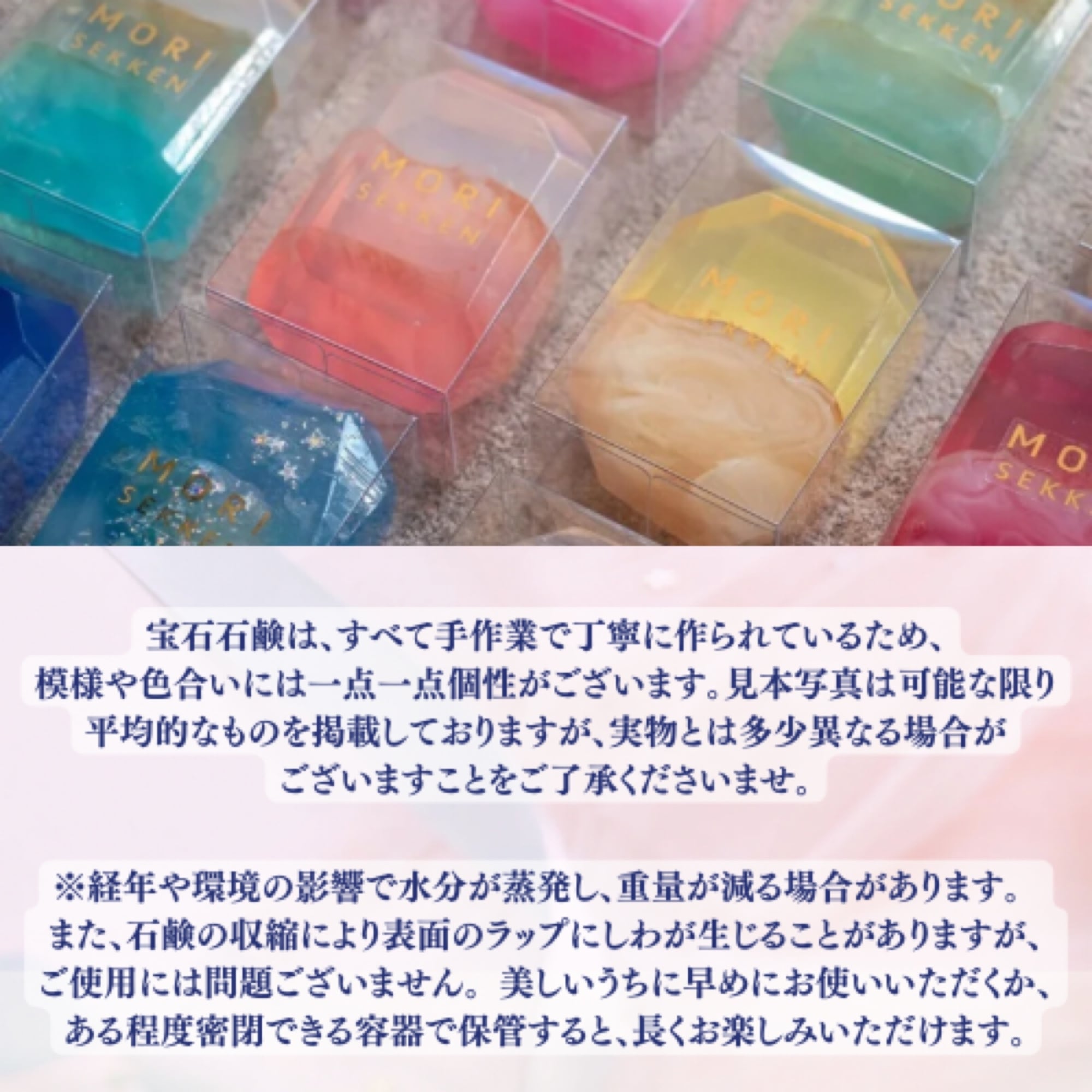 宝石石鹸は、すべて手作業で丁寧に作られているため、模様や色合いには一点一点個性がございます。見本写真は平均的なものを掲載しておりますが、実物とは異なる場合がございますことをご了承くださいませ。お届けしました石鹸が写真と色が違うや、写真と模様の出方が違うなどでお問い合わせ頂きましても、返金や返品、商品の交換には当店ではお応え出来かねます。ハンドメイド作品による個性とご理解くださいませ。