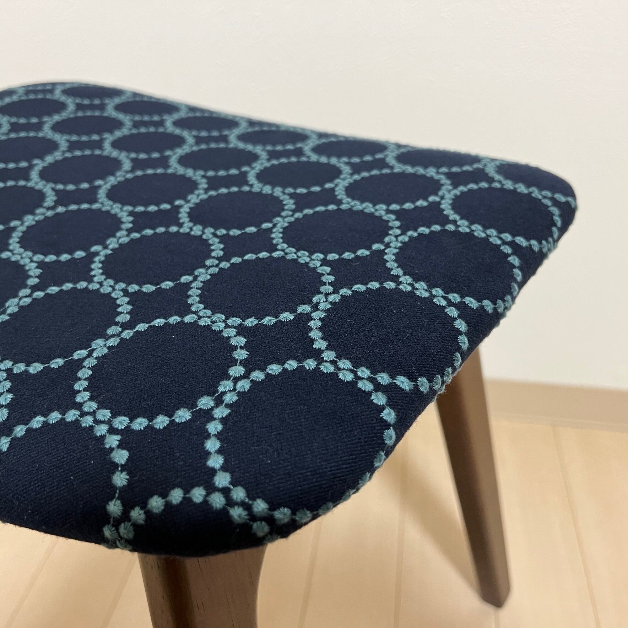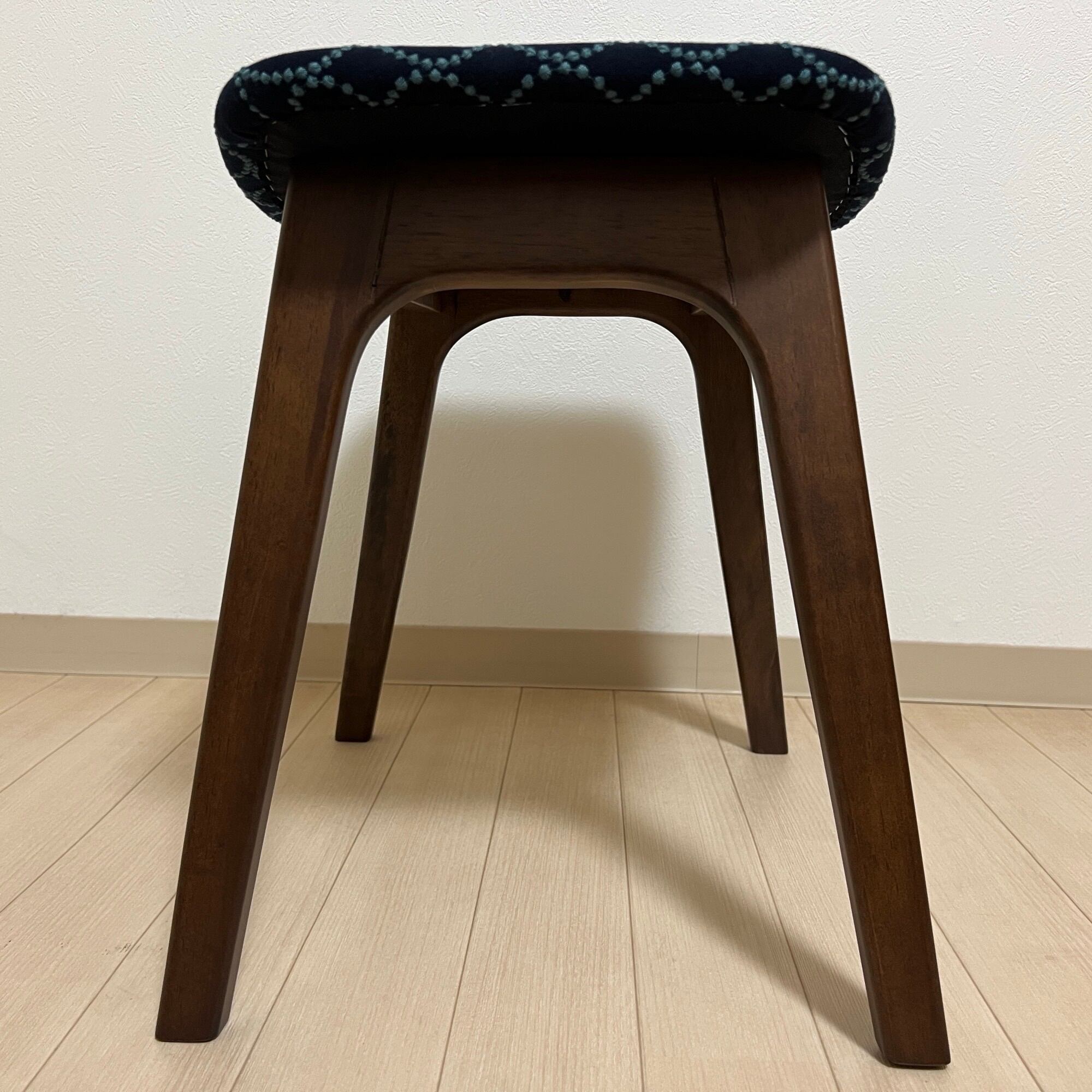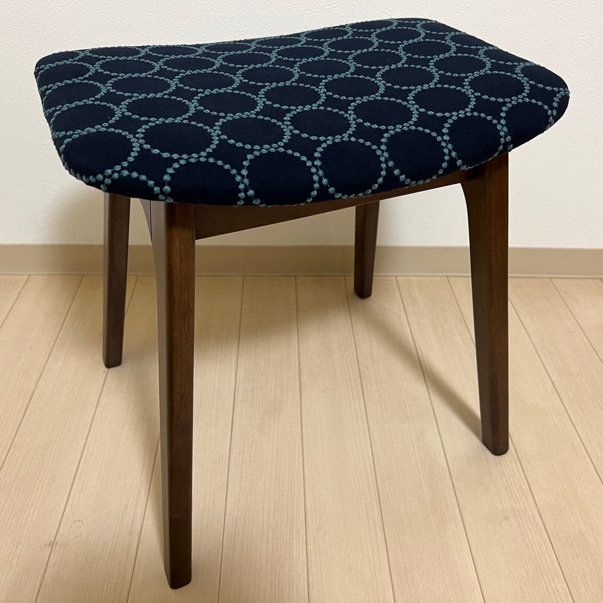 こちらの細脚スクエアスツール、ダークブラウン(ウォルナット色)は、ミナペルホネンのdopのインディゴ/ダークグリーンを使用し、スツールの座面を張替えたハンドメイドの物になります。新品ではございますが、初期の小キズがある場合がございます。
