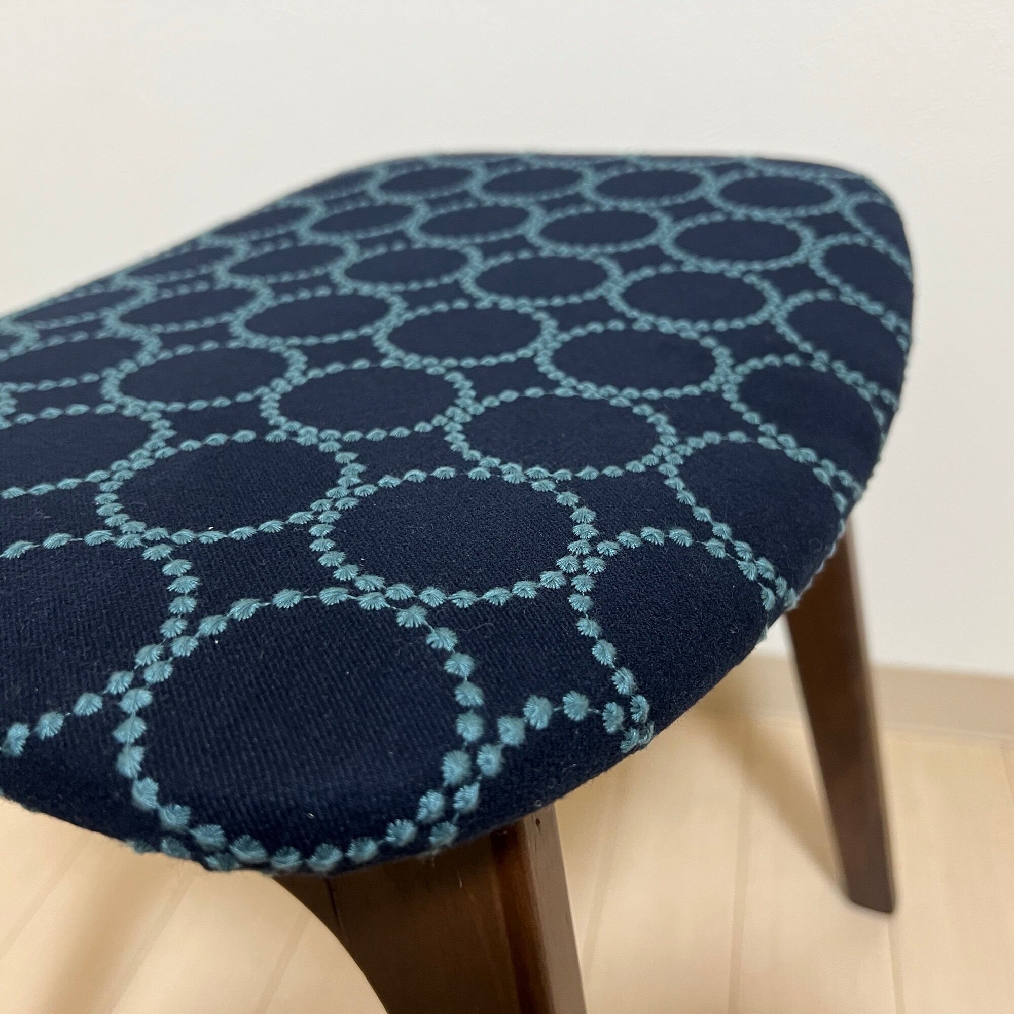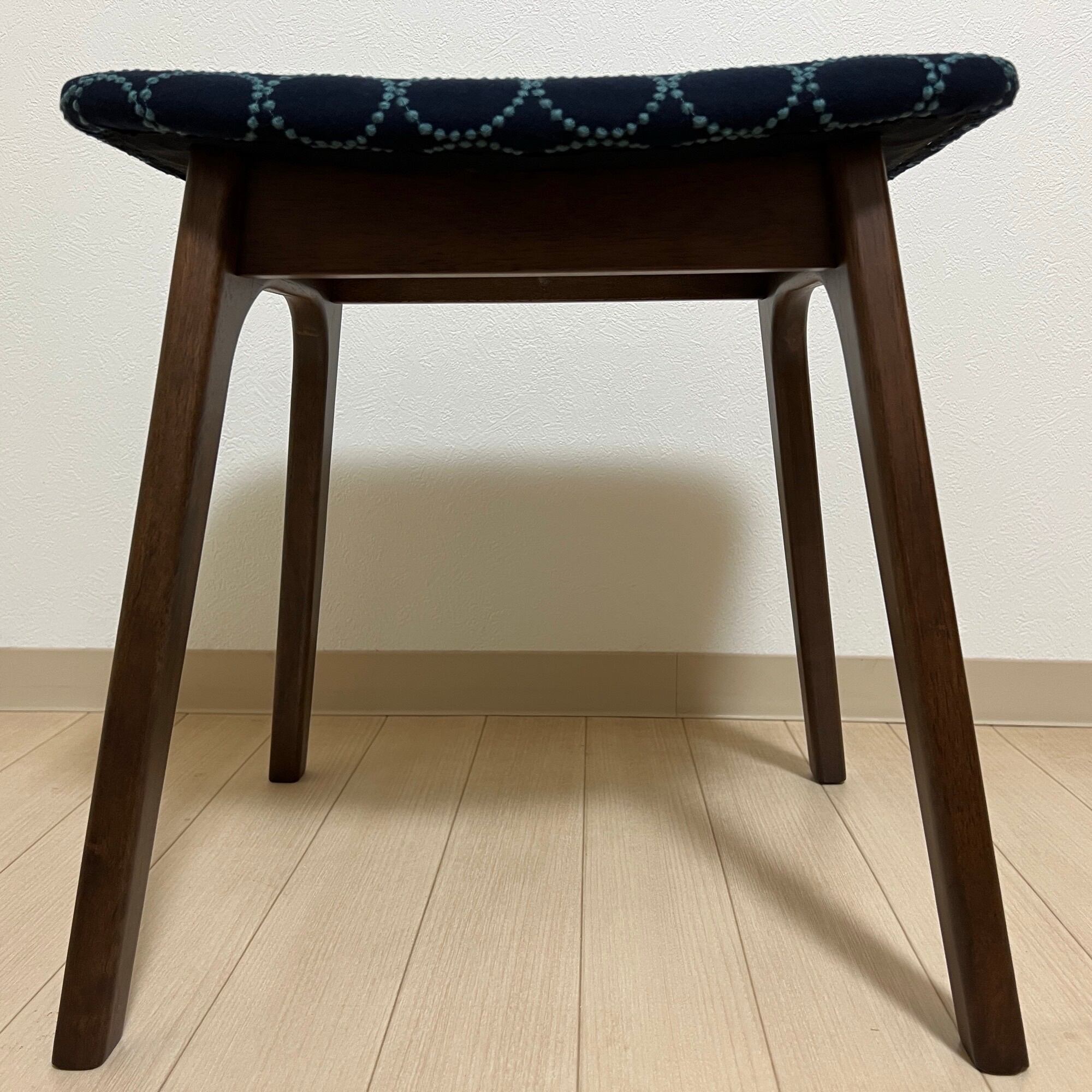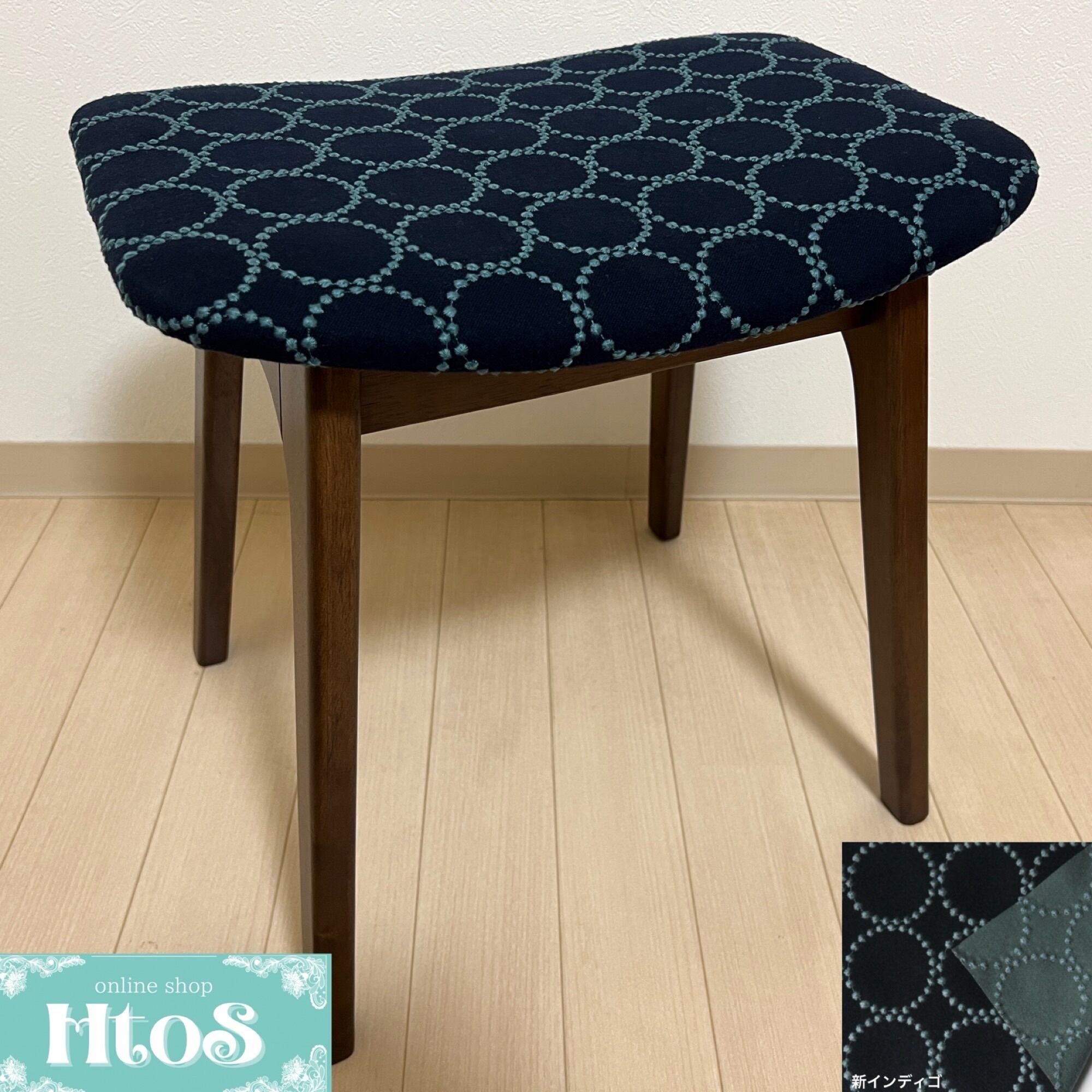 こちらの細脚スクエアスツール、ダークブラウン(ウォルナット色)は、ミナペルホネンのdopのインディゴ/ダークグリーンを使用し、スツールの座面を張替えたハンドメイドの物になります。新品ではございますが、初期の小キズがある場合がございます。