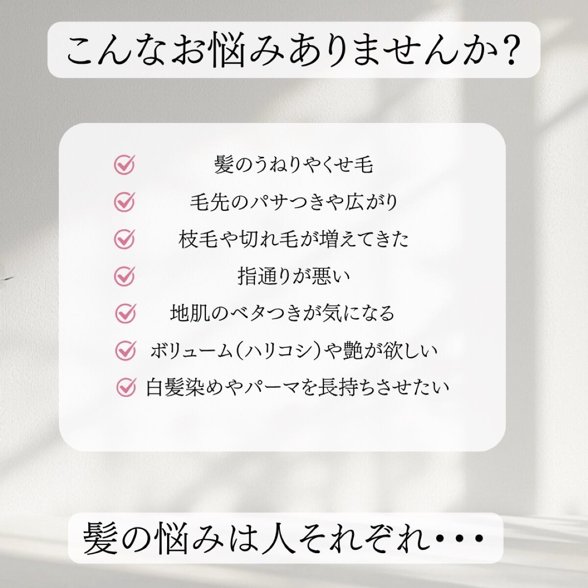 ふだんのシャンプーと同様にお使いください。 非常に泡立ちがいいので、いつもより少量からお試しいただけます。 切れ毛・枝毛や髪のダメージが気になる方は、泡立てたまま数分程度おく**「泡パック」**をすると、ケラチンなどの成分がより浸透し、より効果的です。