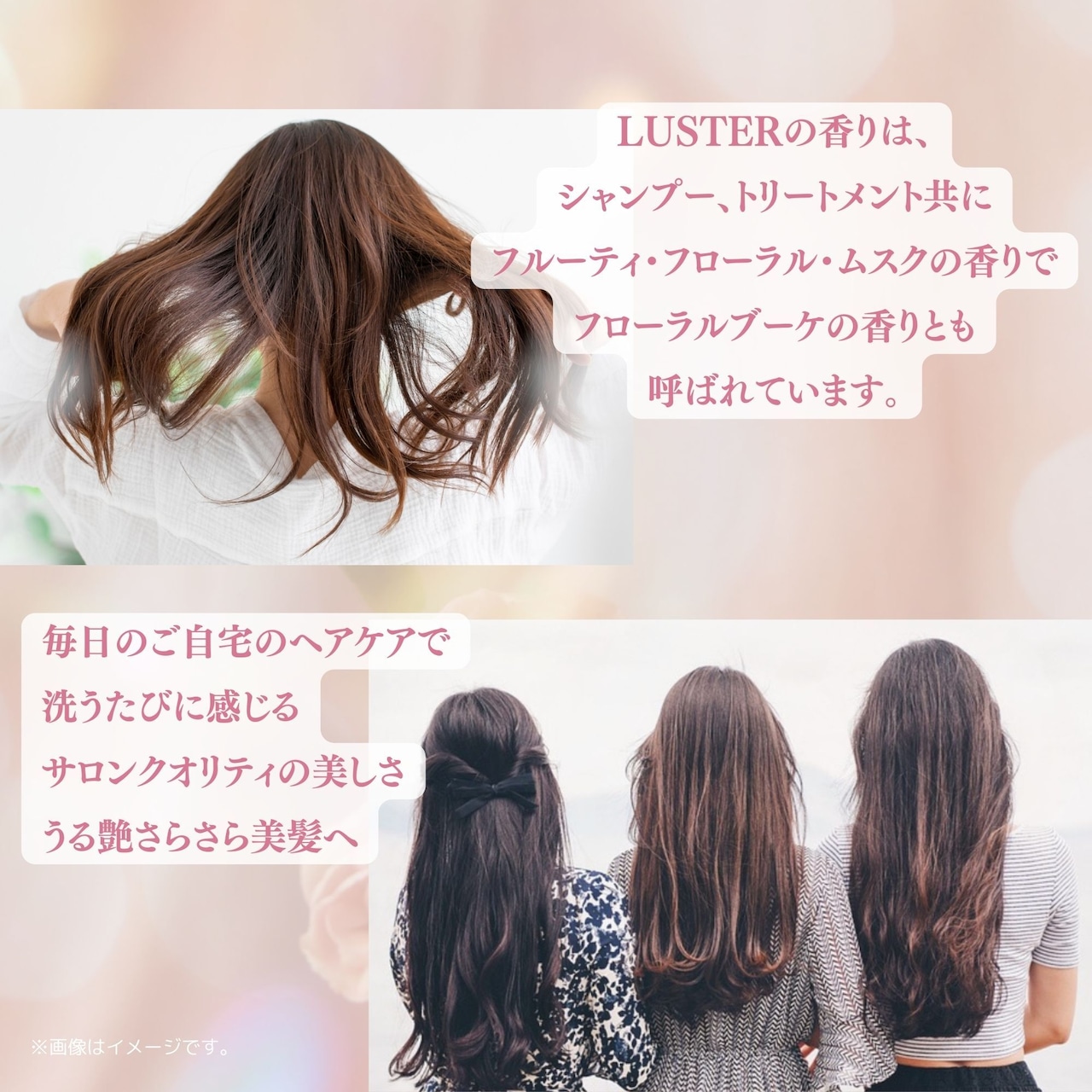 ● シャンプー: アミノ酸系・ノンシリコン・硫酸系フリー。「洗うたび、驚くほどなめらかな指通りへ」導き、摩擦を抑えてしなやかに洗い上げます。 泡立ちが良いので、少量の使用でもスッキリとした洗い心地です。
