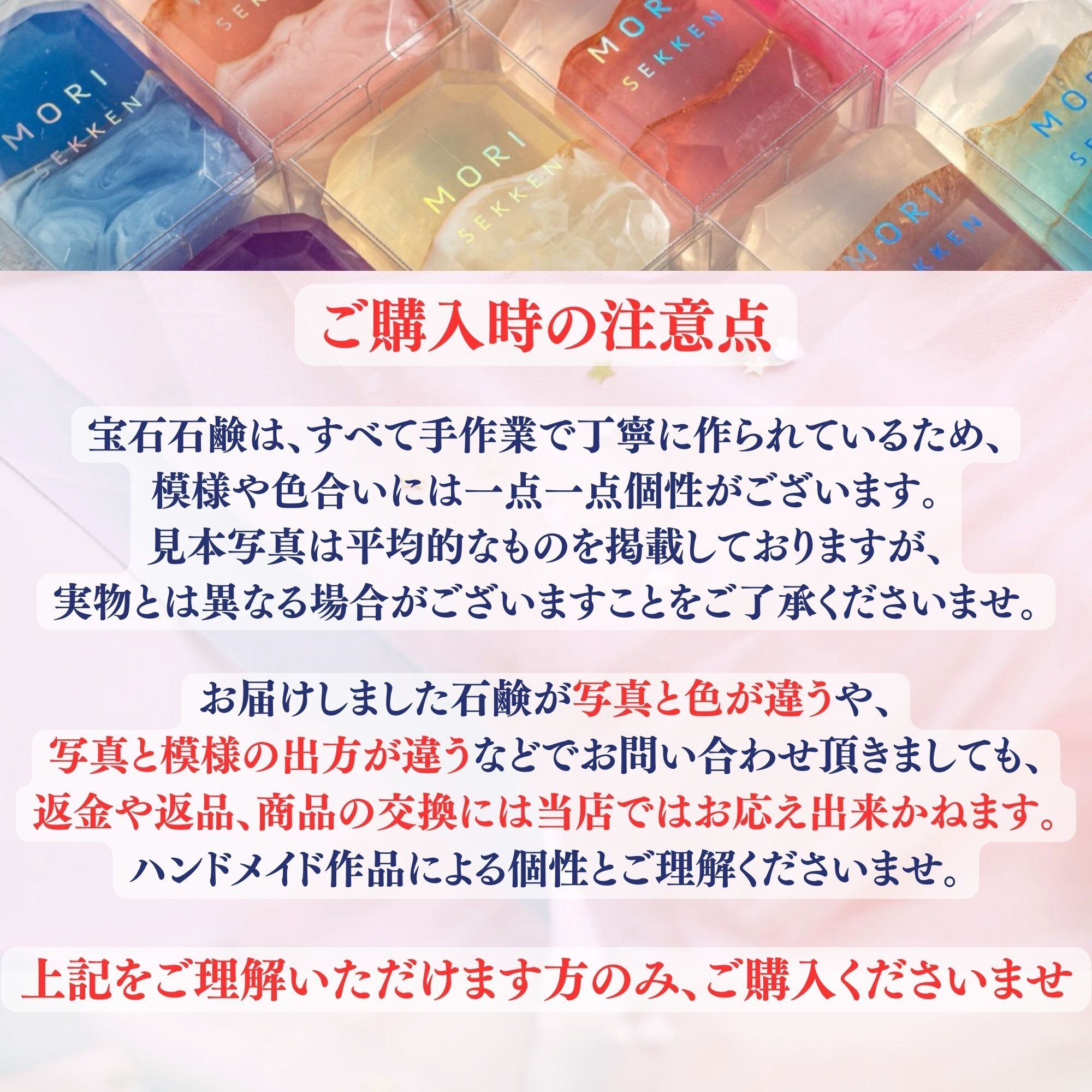 宝石石鹸は、すべて手作業で丁寧に作られているため、模様や色合いには一点一点個性がございます。見本写真は平均的なものを掲載しておりますが、実物とは異なる場合がございますことをご了承くださいませ。お届けしました石鹸が写真と色が違うや、写真と模様の出方が違うなどでお問い合わせ頂きましても、返金や返品、商品の交換には当店ではお応え出来かねます。ハンドメイド作品による個性とご理解くださいませ。