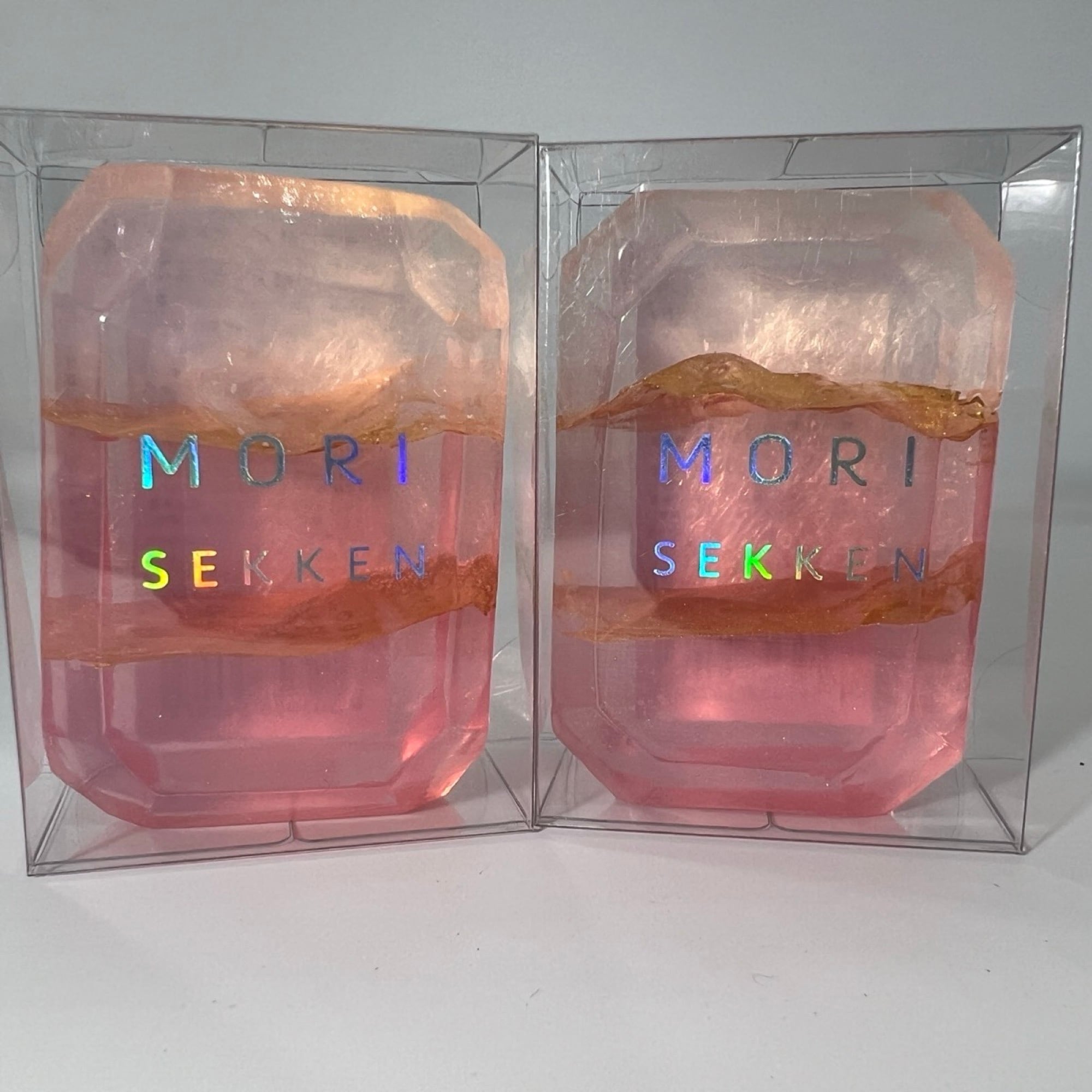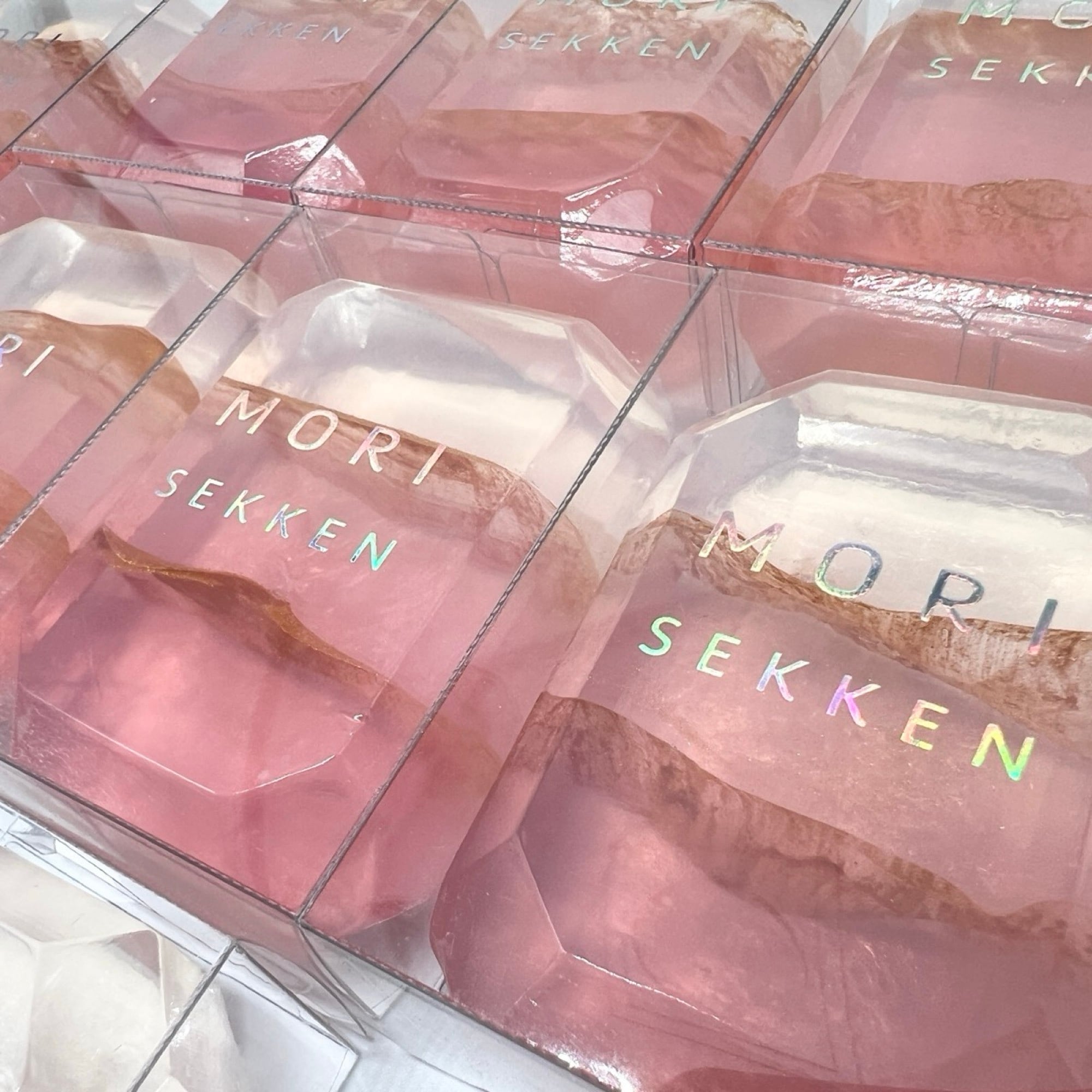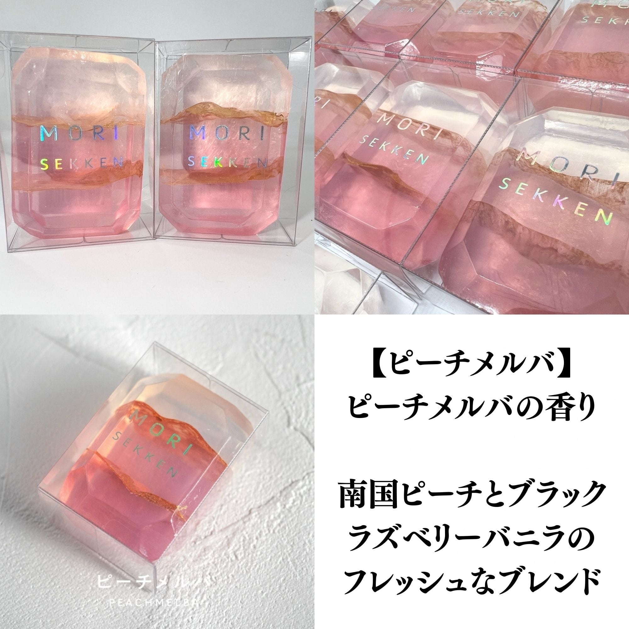 森石鹸の宝石石鹸 ピーチメルバ。透明感のあるピンクカラーと、南国ピーチとブラックラズベリーバニラが重なる甘く華やかな香りが広がる固形石鹸です。かわいらしい石鹸ギフトとしても人気のハンドメイド石けんです。