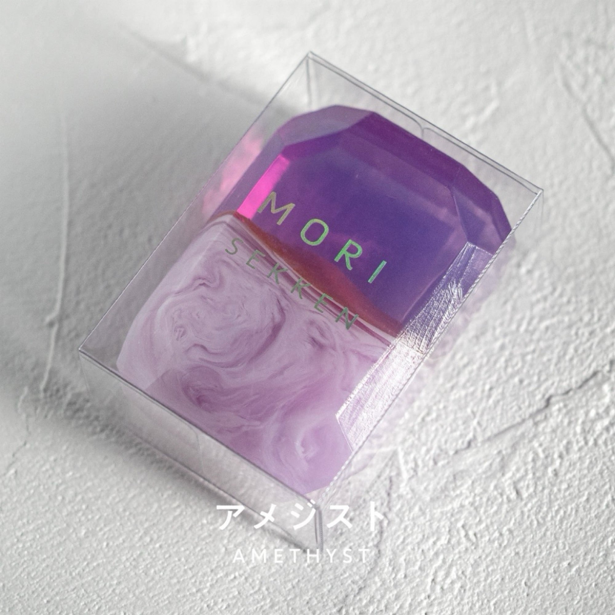 森石鹸の宝石石鹸 アメジスト。透明感のあるパープルカラーと、ブルガリア産真正ラベンダー精油のやさしい香りが広がる固形石鹸です。落ち着いた上品な印象の石鹸ギフトとしても選ばれています