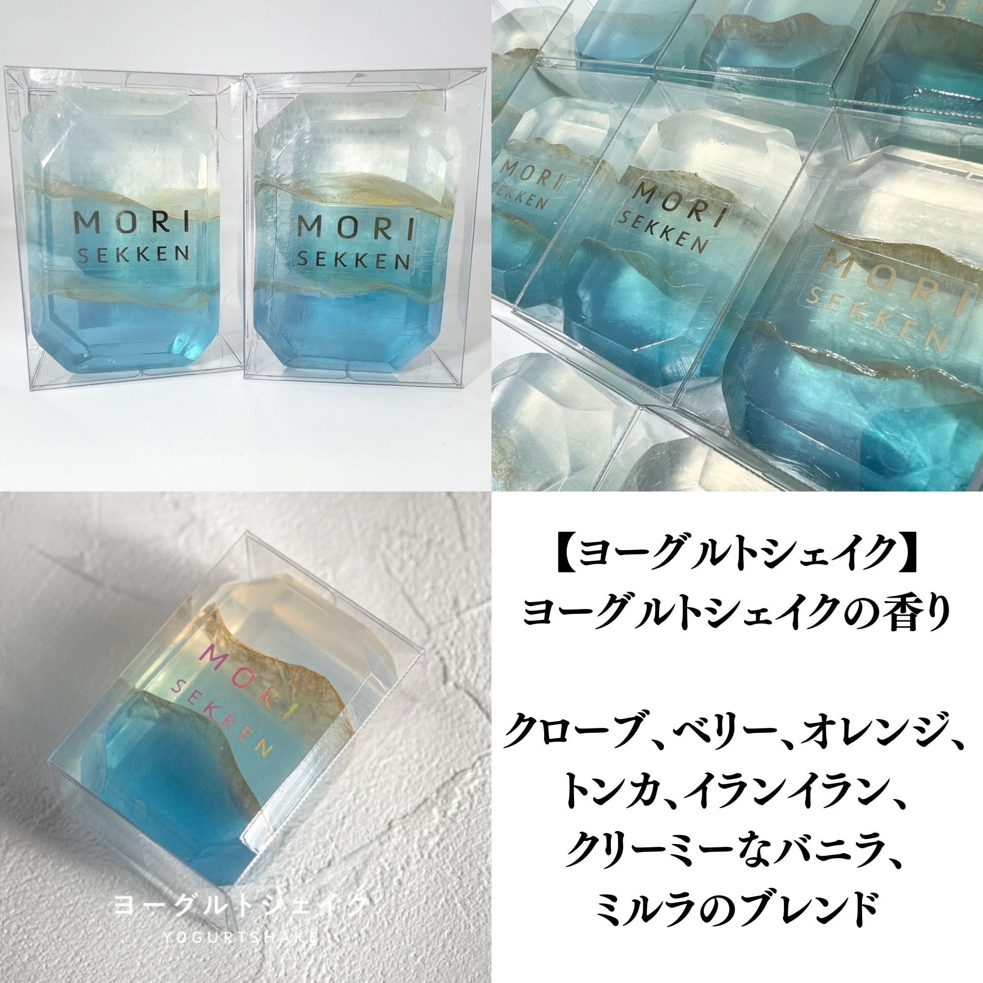 森石鹸の宝石石鹸 ヨーグルトシェイク。やわらかなブルーの色合いと、クローブやベリー、オレンジ、トンカ、イランイラン、バニラが重なる甘くクリーミーな香りが広がる固形石鹸です。かわいらしい石鹸ギフトとしても選ばれています。
