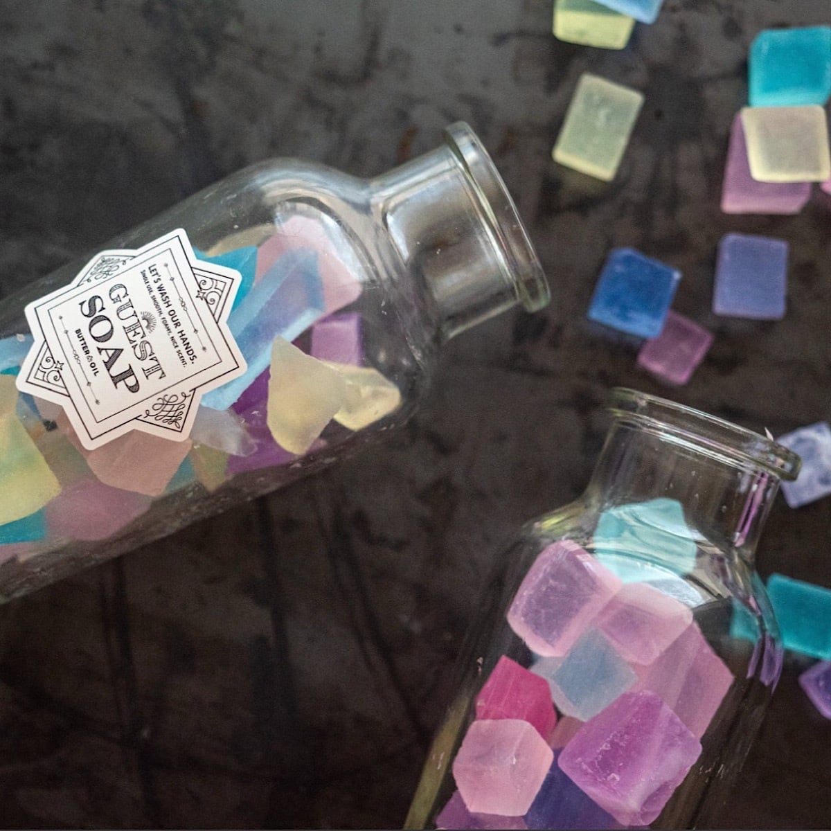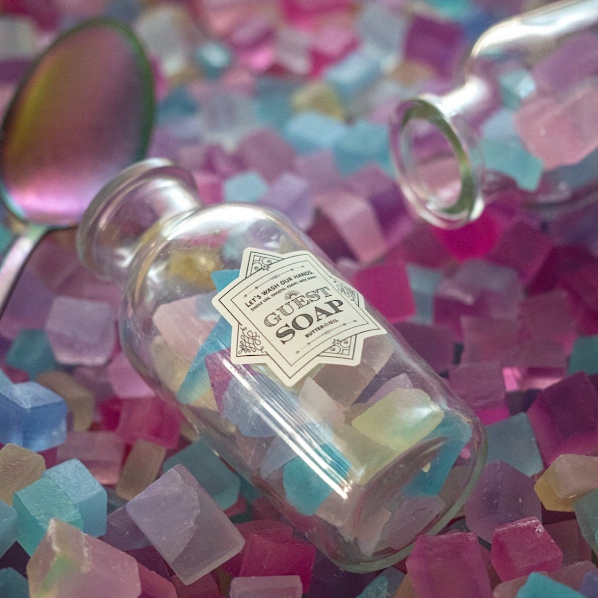 森石鹸のゲストソープ。宝石石鹸のかけらを瓶に詰めた、かわいい瓶入りの固形石鹸です。石鹸ギフトやプチギフト、ちょっとした贈り物やプレゼントとしても人気のハンドメイド石けん。