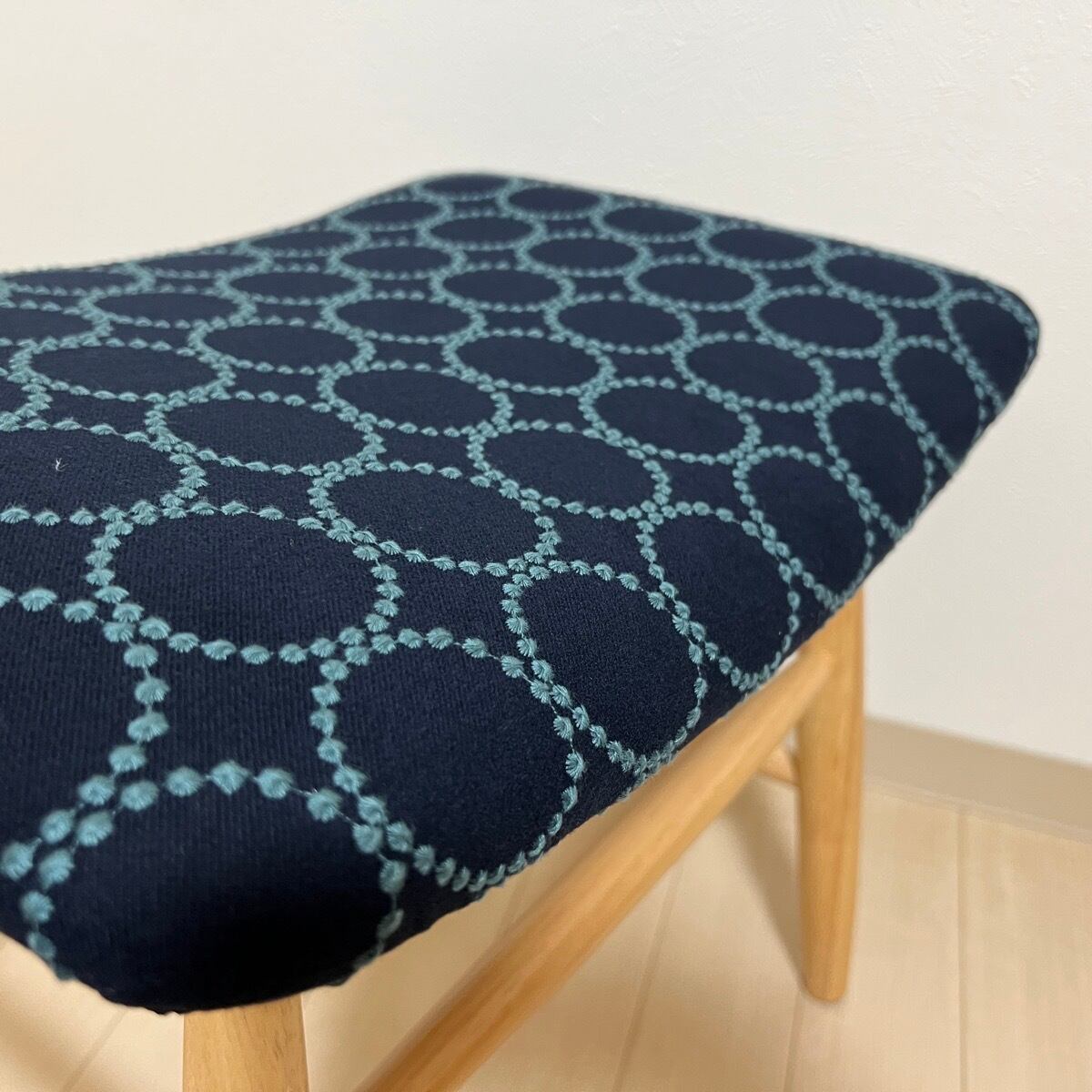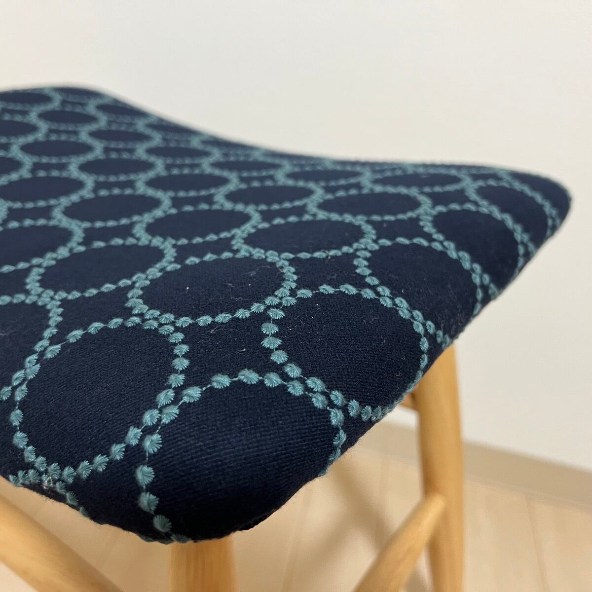 こちらのスクエアスツールは、ミナペルホネンのdopの新しいインディゴ/ダークグリーンを使用し、丸脚のスクエアスツールの座面を張替えたハンドメイドの物になります。スツールは新品ではございますが、初期の小キズがある場合がございます。