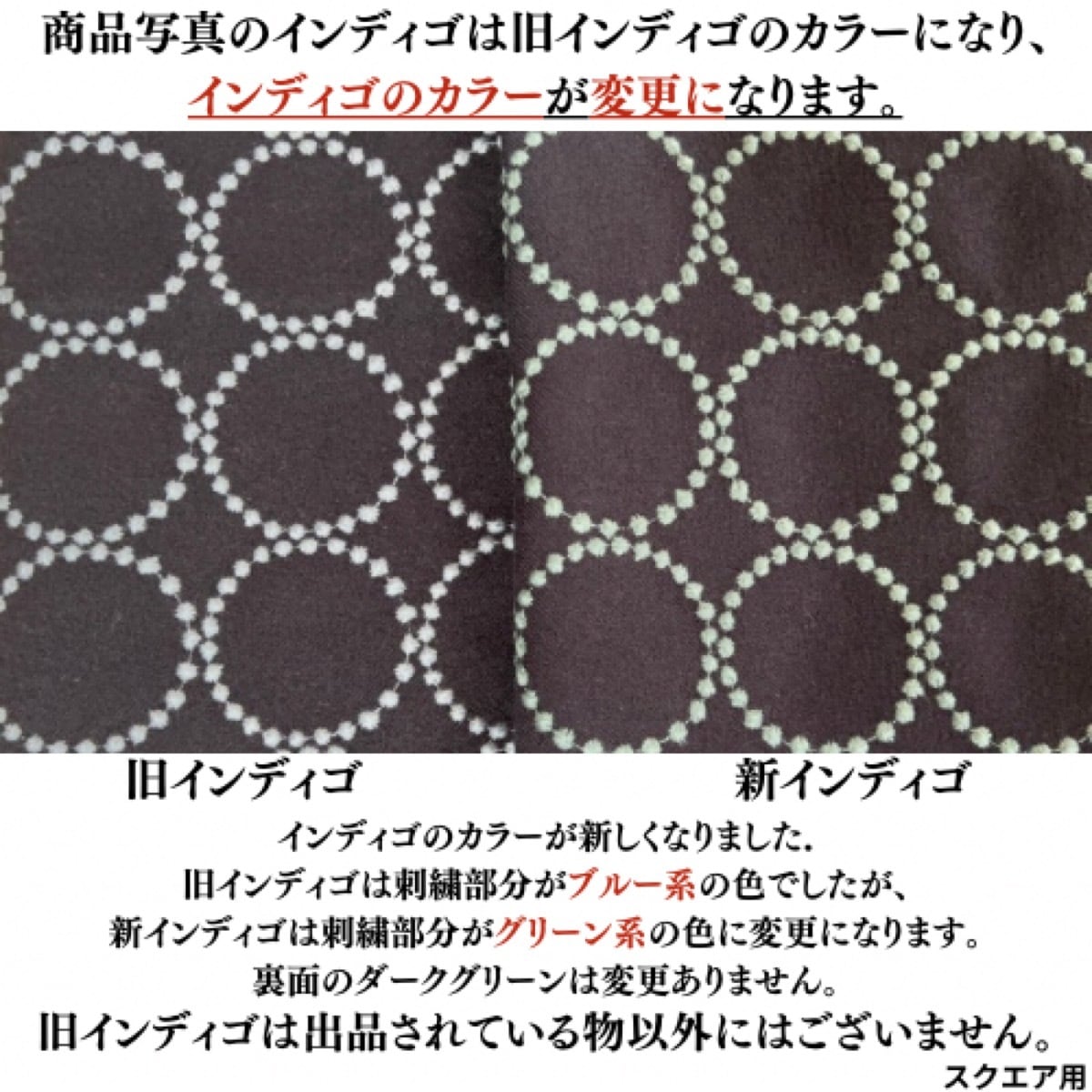 ※インディゴ/ダークグリーンのカラーが新しくなって刺繍の色のみブルー系からグリーン系へ変更になっております。旧インディゴの生地は出品している物以外はございません。