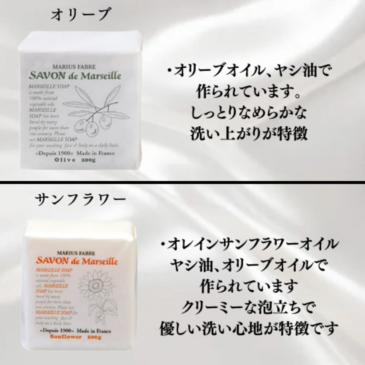 マリウスファーブル社のサボンドマルセイユ石鹸は、着色料も香料も防腐剤も一切使われていないオリーブ油をベースとした、原料100%天然植物油で作られたフランス製の自然派石鹸です。サボンドマルセイユ石鹸は1900年創業のマリウスファーブル社のマルセイユ石鹸です。釜炊きけん化法という伝統製法で作られたマルセイユ石鹸は、泡切れがよく洗浄力がありながら低刺激でお肌を優しくしっとりと洗い上げる為、シャンプーとしてもお使い頂けます。